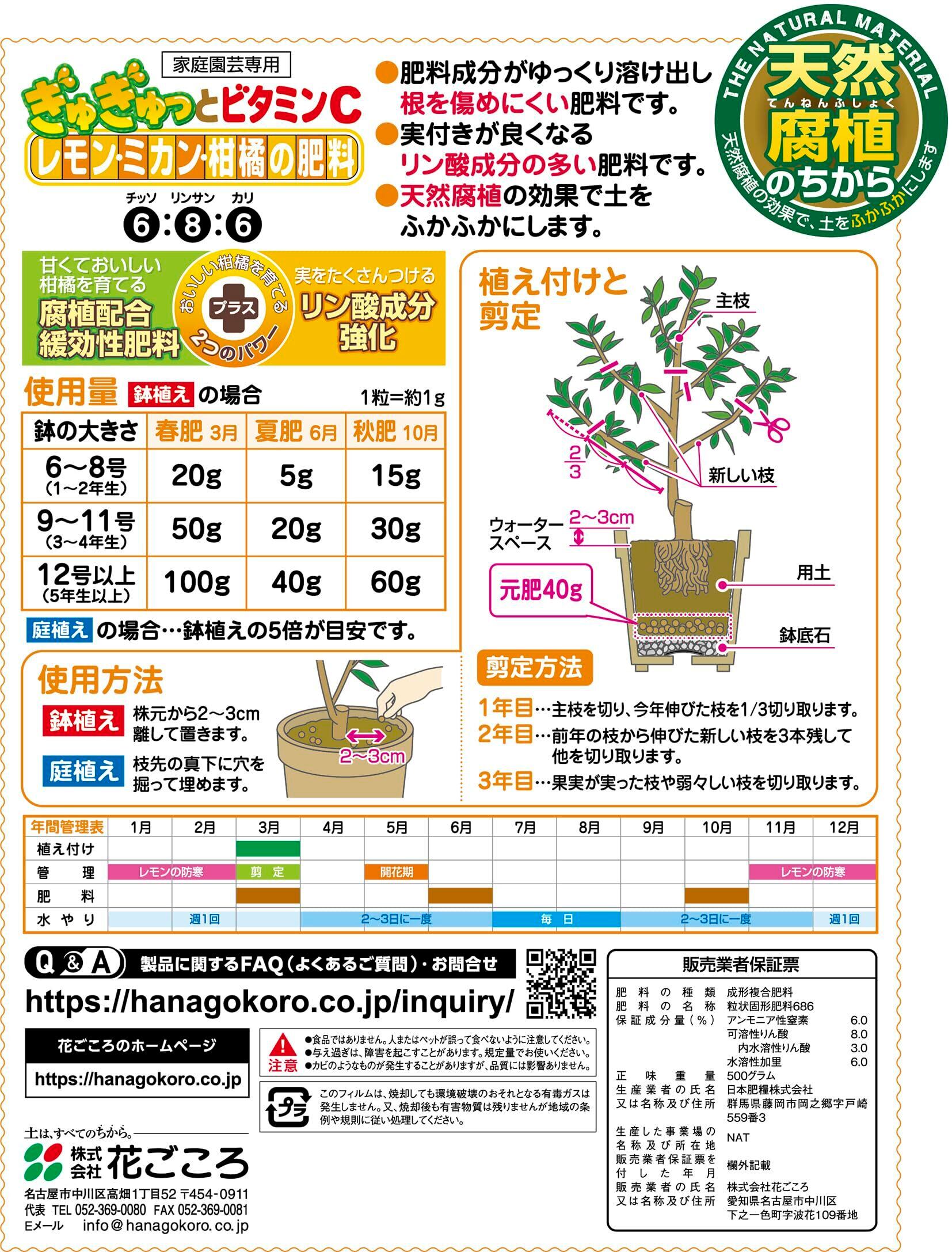 【限定セール】花ごころ レモン・ミカン・柑橘の肥料 花付き、実付きが良くなるリン酸多め 500g