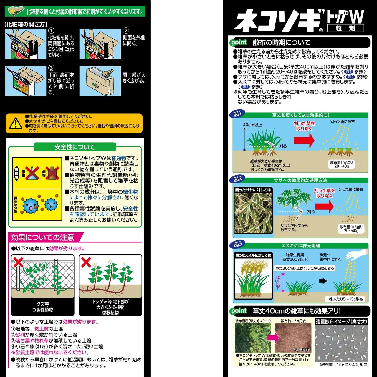パラパラ撒くだけで雑草(ササ・ススキ)を長期間枯らす。(約9か月) パラパラまくだけで草丈の高い雑草、ササ、ススキを根までも枯らす粒状除草剤。 長期間雑草の発生を抑える。 駐車場や空き地など水場がない所でも使いやすい。