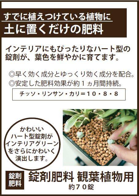 特長:インテリアグリーンでの小さな鉢にも使いやすいよう、1錠当たりが小さい可愛いハート型。