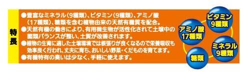 ・豊富なミネラル(9種類)、ビタミン(9種類)、アミノ酸(17種類)、糖類を含む植物由来の天然有機質を配合