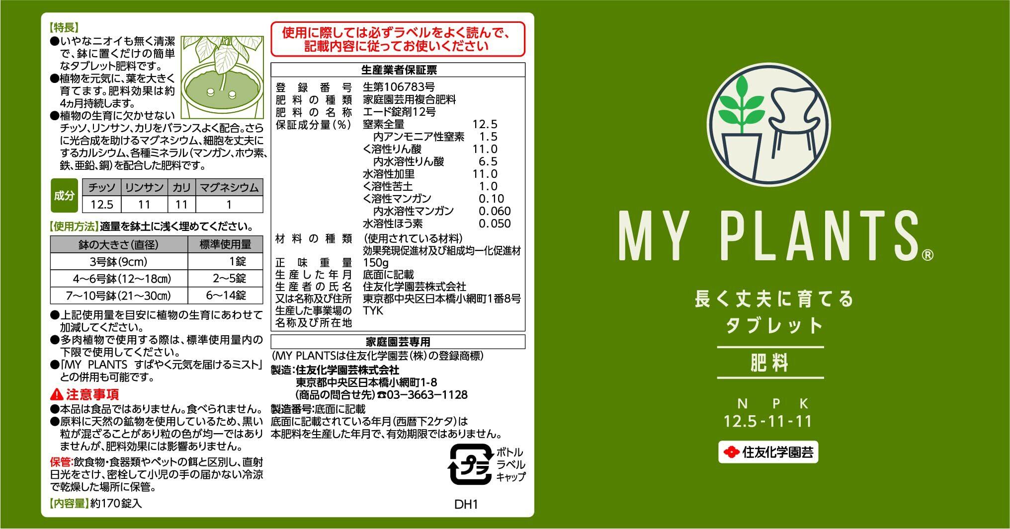 【2025最新】住友化学園芸 肥料 MY PLANTS 長く丈夫に育てるタブレット170錠 観葉植物 肥料