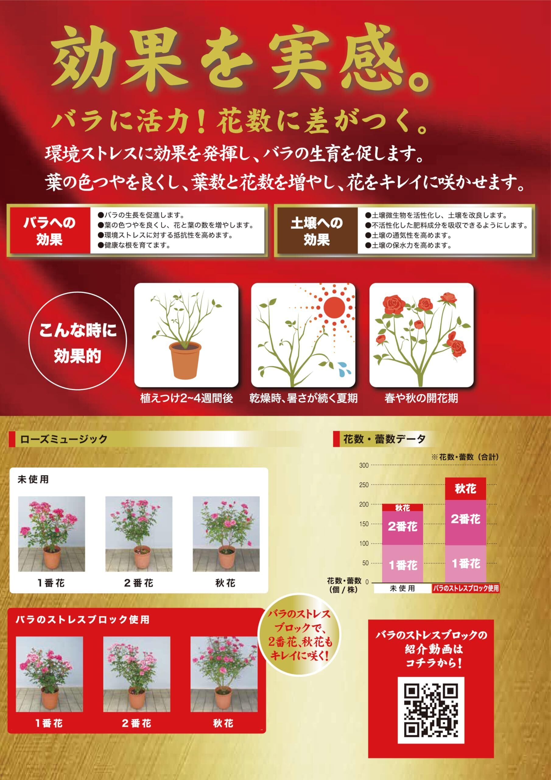 植物本来の力で株が充実。花数、花、葉色がアップ。病気や害虫にも強くなる。土壌生物を活性化し、土壌を改良します。