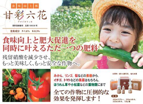 【使用方法】500倍〜1000倍に希釈し灌水してください。育苗期:週に1回、定植前・定植直後:5日間隔で2~3回、栽培期:1ヶ月に1回のペースで行ってください。 葉面散布でもご利用いただけます。