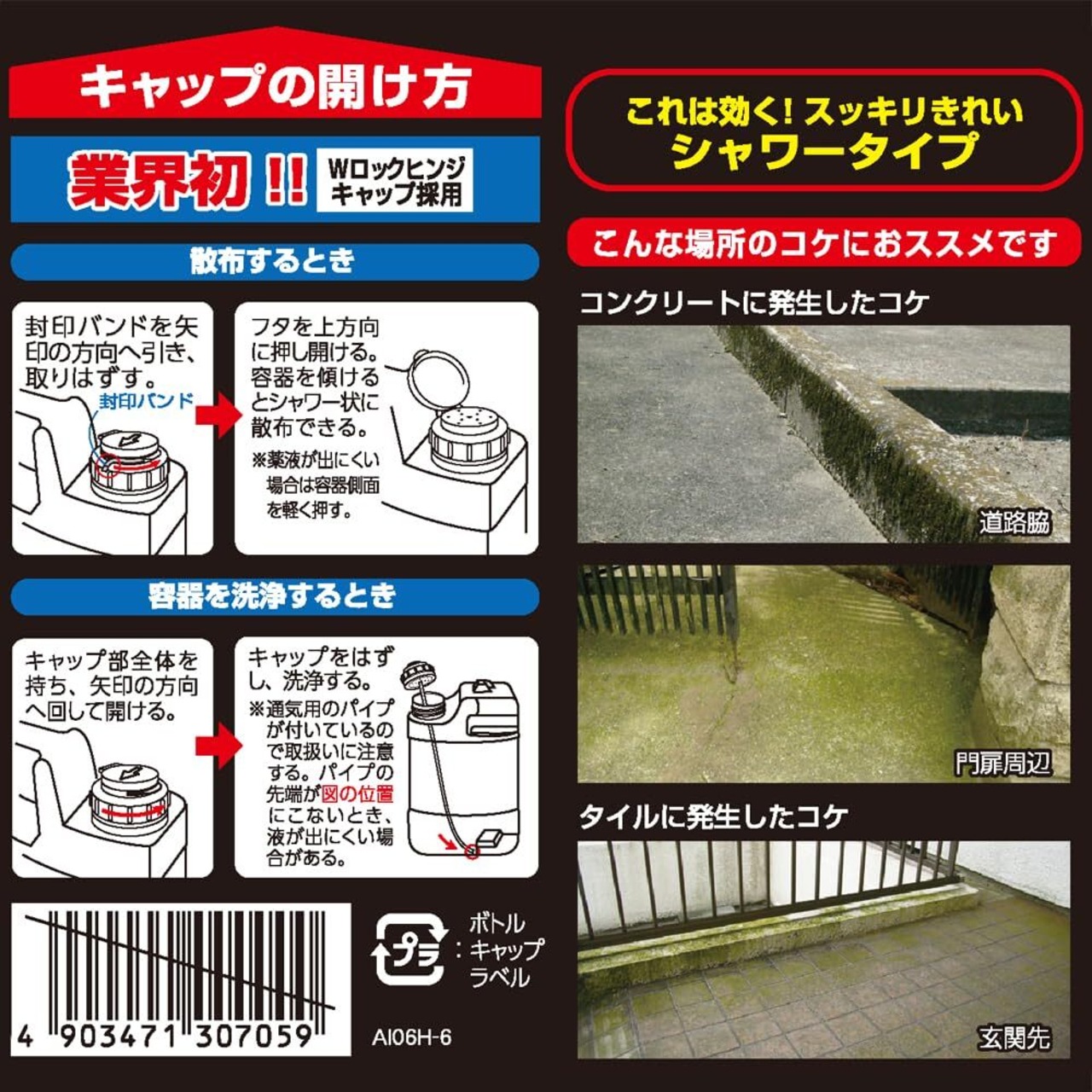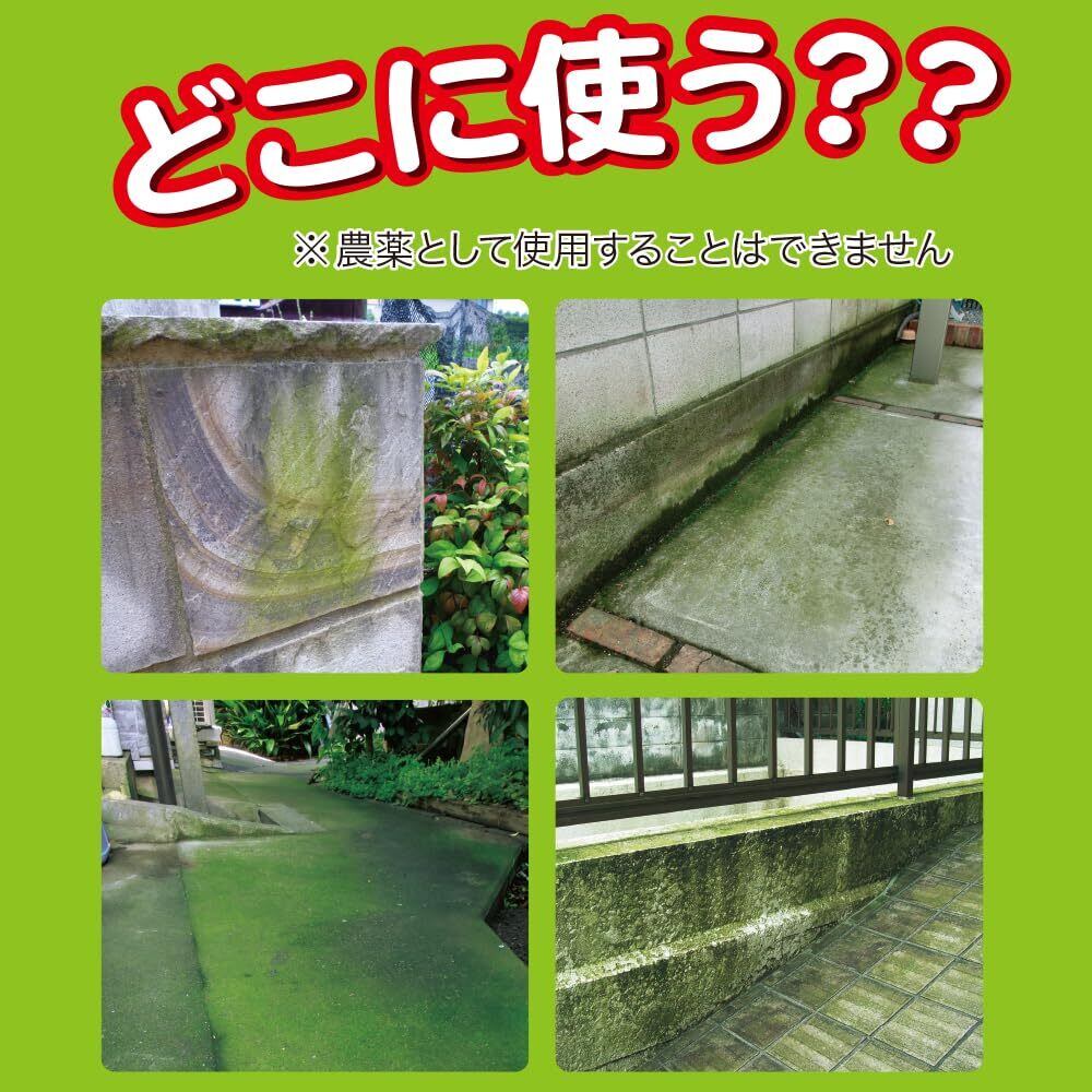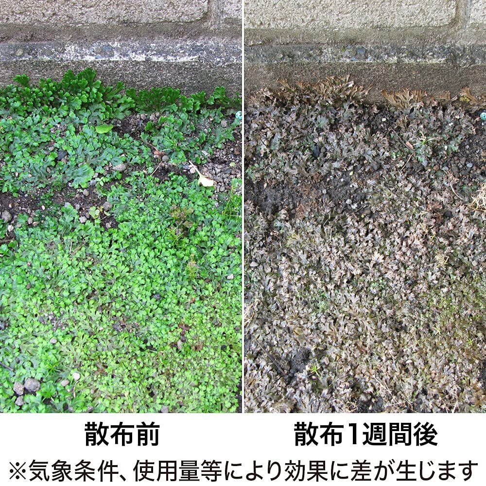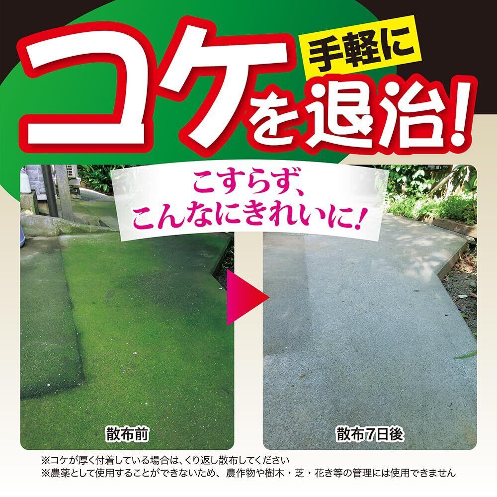 ・通常、散布翌日から3日後には効果が現れるが、コケの度合いや気象条件によって除去日数は異なり(雨天・曇天時は効果が劣る)、コケが厚く付着している場所にはくり返し散布