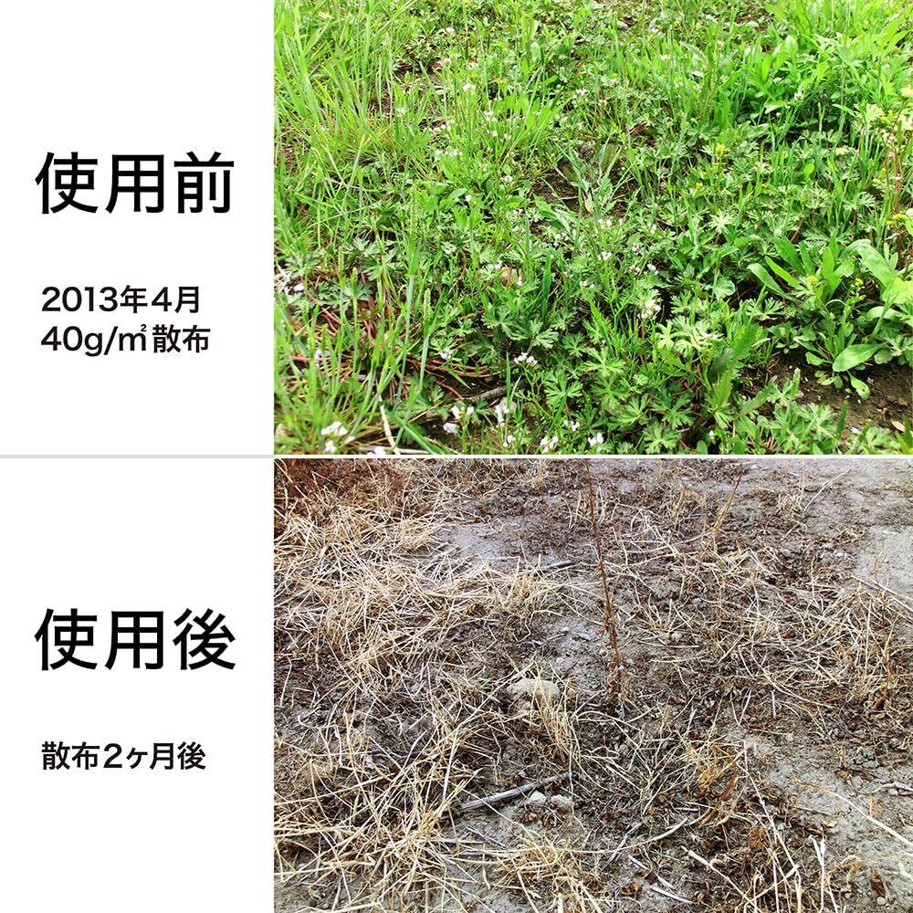 ・効き目は天候や土壌条件により違うが、約30日前後でほとんど枯らし、約3~6ヶ月雑草の発生を抑える(土壌条件、気象条件、使用量などにより差が生じる)