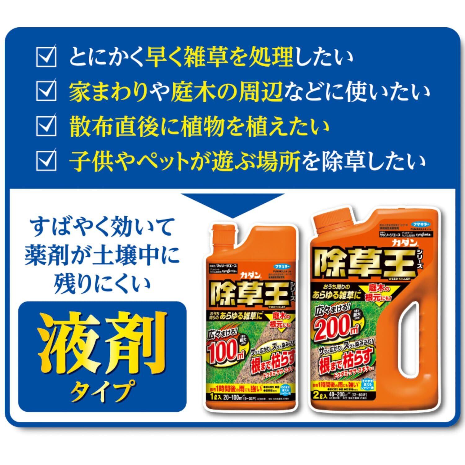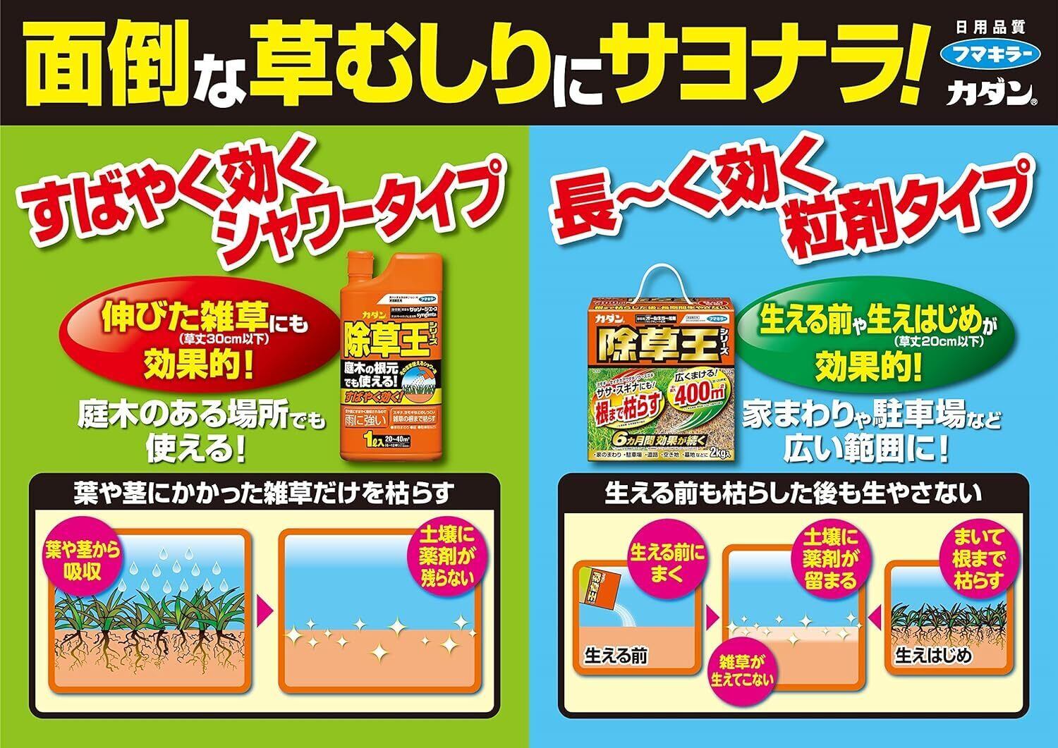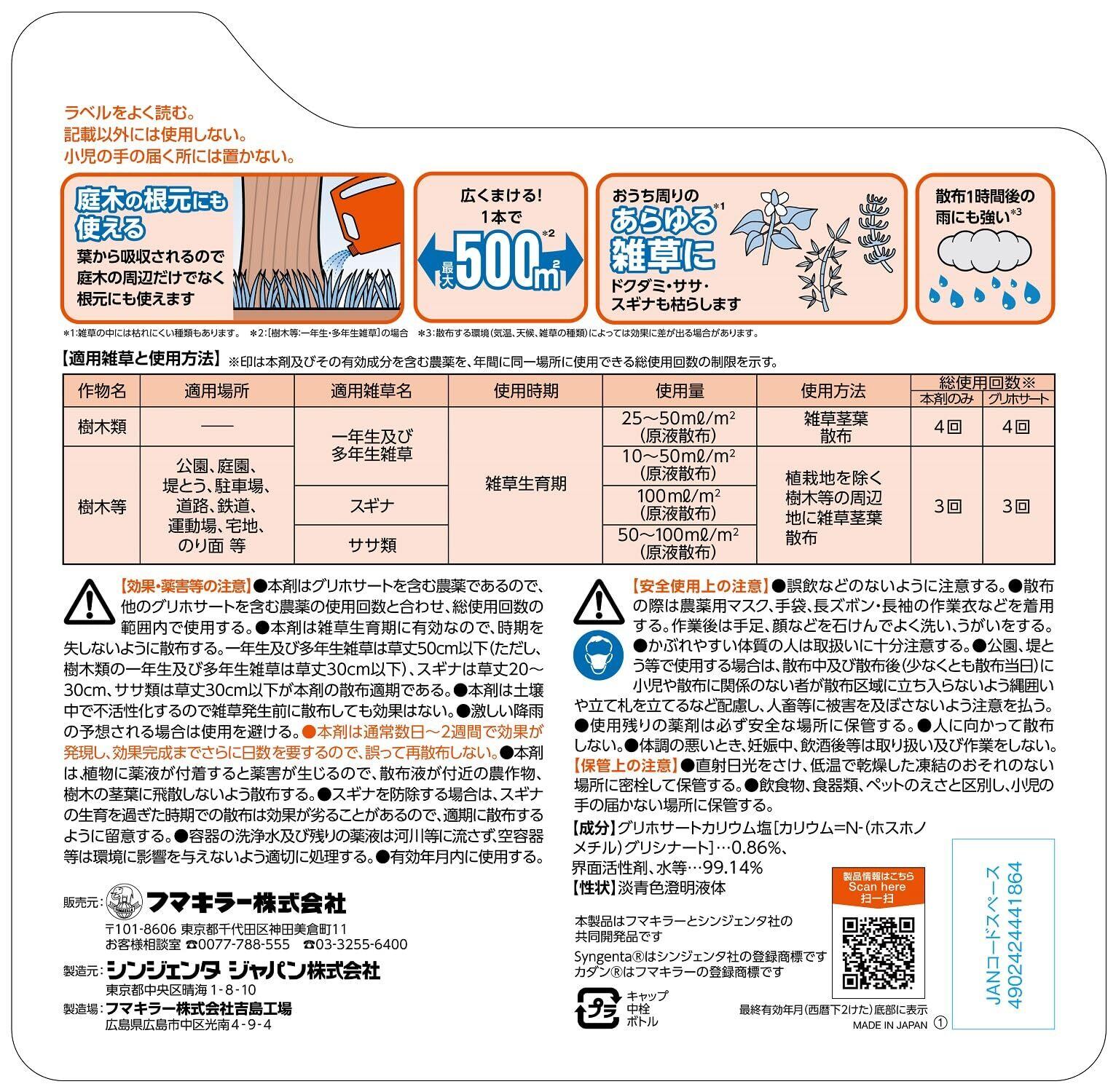 庭木の根元にもつける速効タイプの除草剤 【特徴】 ・広い範囲もしっかりカバー ・独自処方でしっかり付着、根まで枯らします ・除草成分がすばやく浸透するので、雨に強く安定した効果を発揮 ・庭木の根元に散布できます 【注意事項】 使用に際しては必ずをよく読んで、記載内容に従ってご使用ください