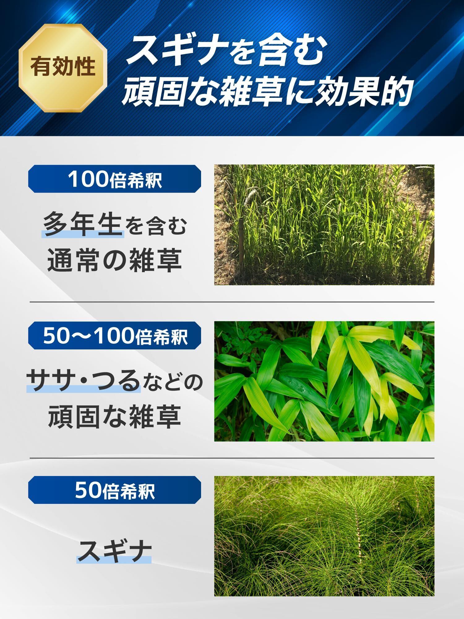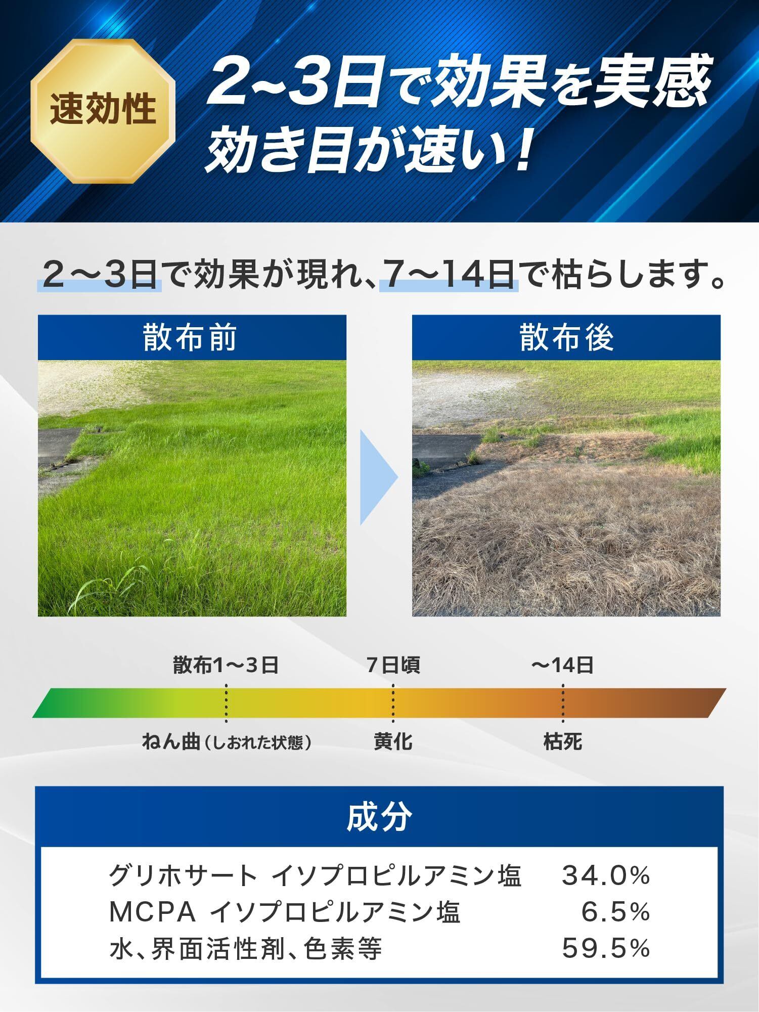【除草効果の持続】2~3日で効果が現れ、7~14日で枯死完了。スギナを含むあらゆる雑草に有効で、頑固な雑草も速効で枯らします。