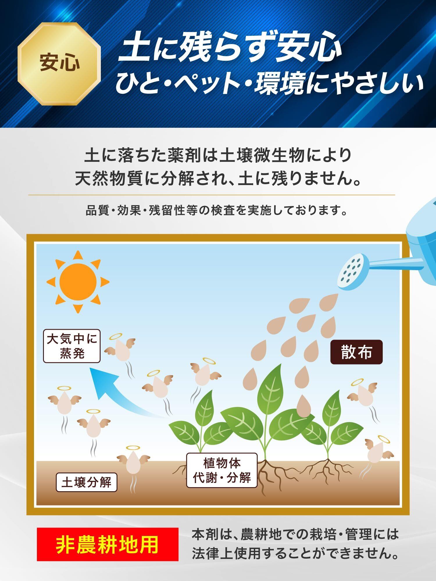 環境にやさしい設計: 土壌に残留せず、自然分解。周囲の植物や土壌に影響を与えない安全な成分。