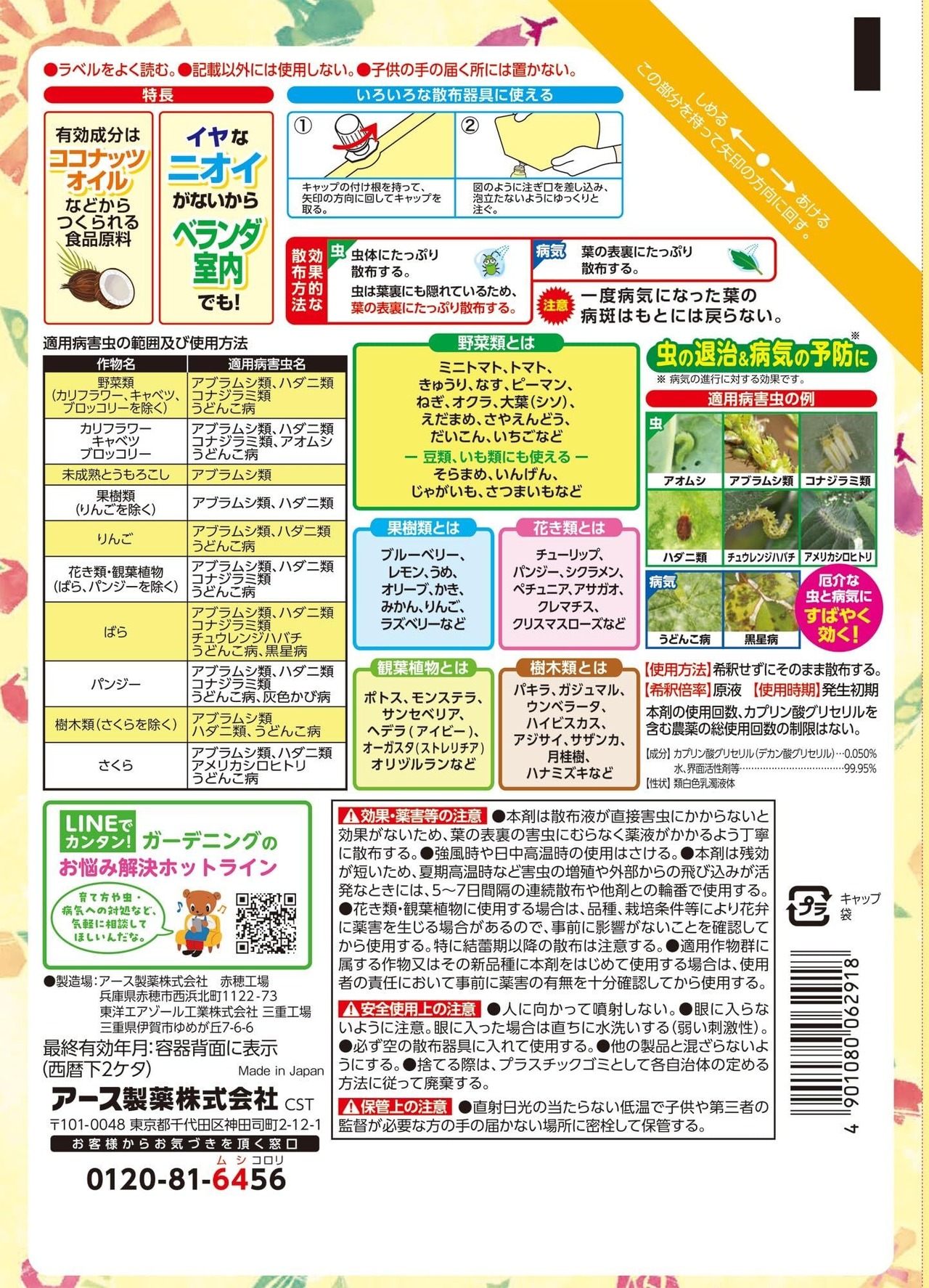 【適用病害虫の例】虫:アオムシ、アブラムシ類、コナジラミ類、ハダニ類、チュウレンジハバチ、アメリカシロヒトリ/病気:うどんこ病、黒星病