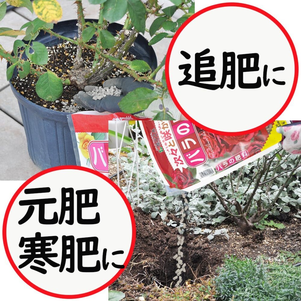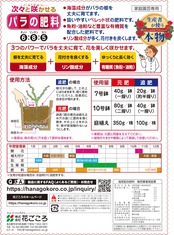 使用方法:元肥/庭植え350g、鉢植え80g、追肥/庭植え100g、鉢植え40g