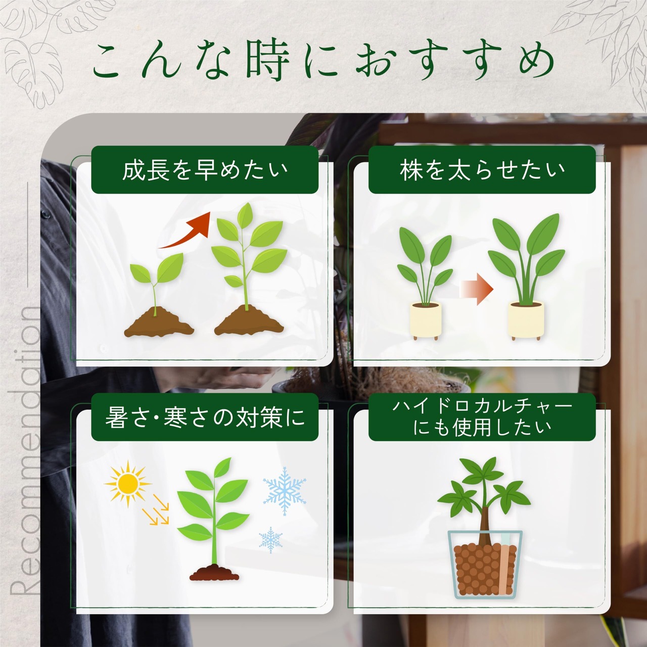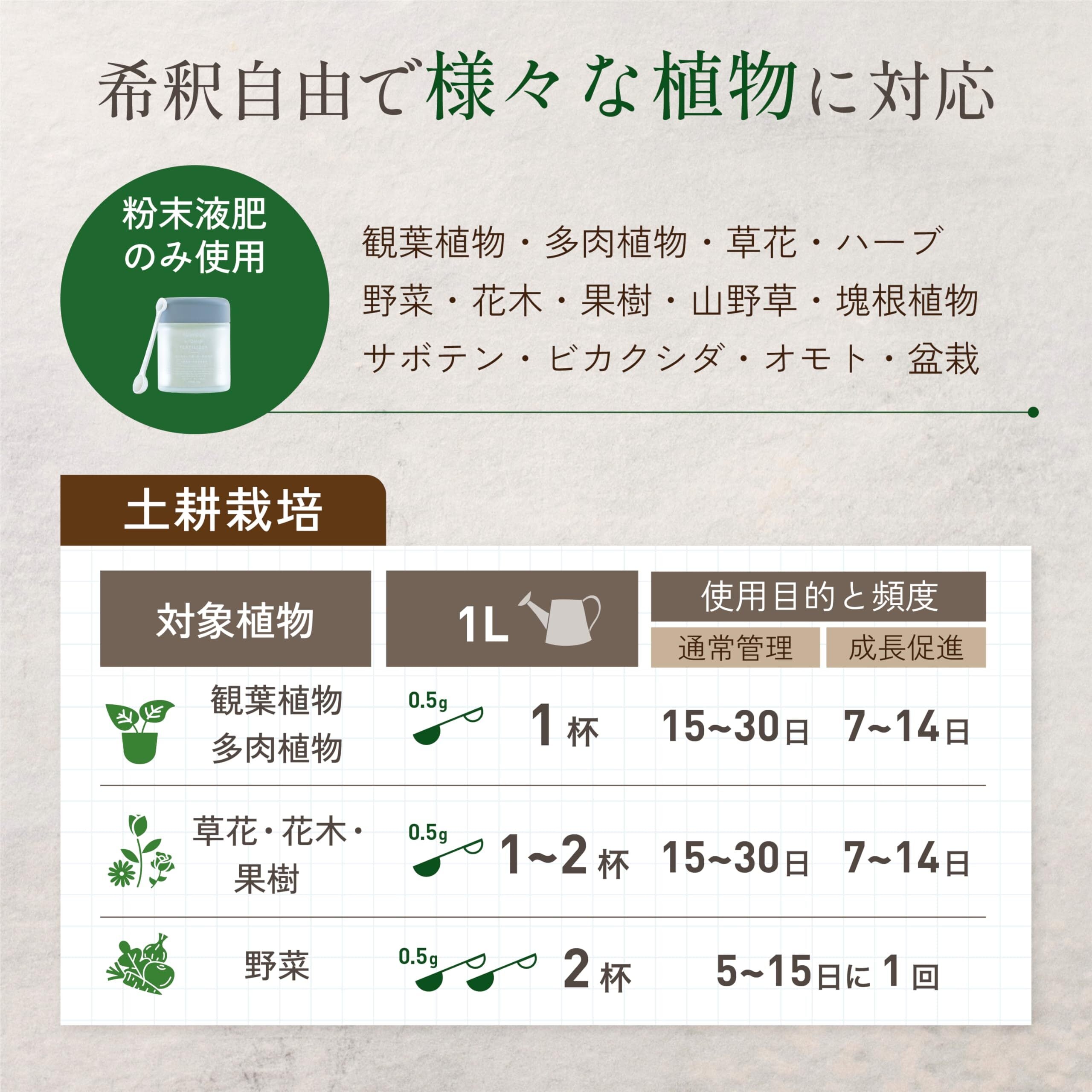 観葉植物 、 多肉植物 、 塊根植物 、 ビカクシダ 、 草花 、 花木 、 果樹 、 野菜 など様々な植物に使える
