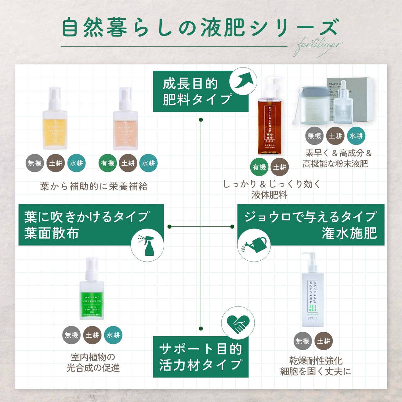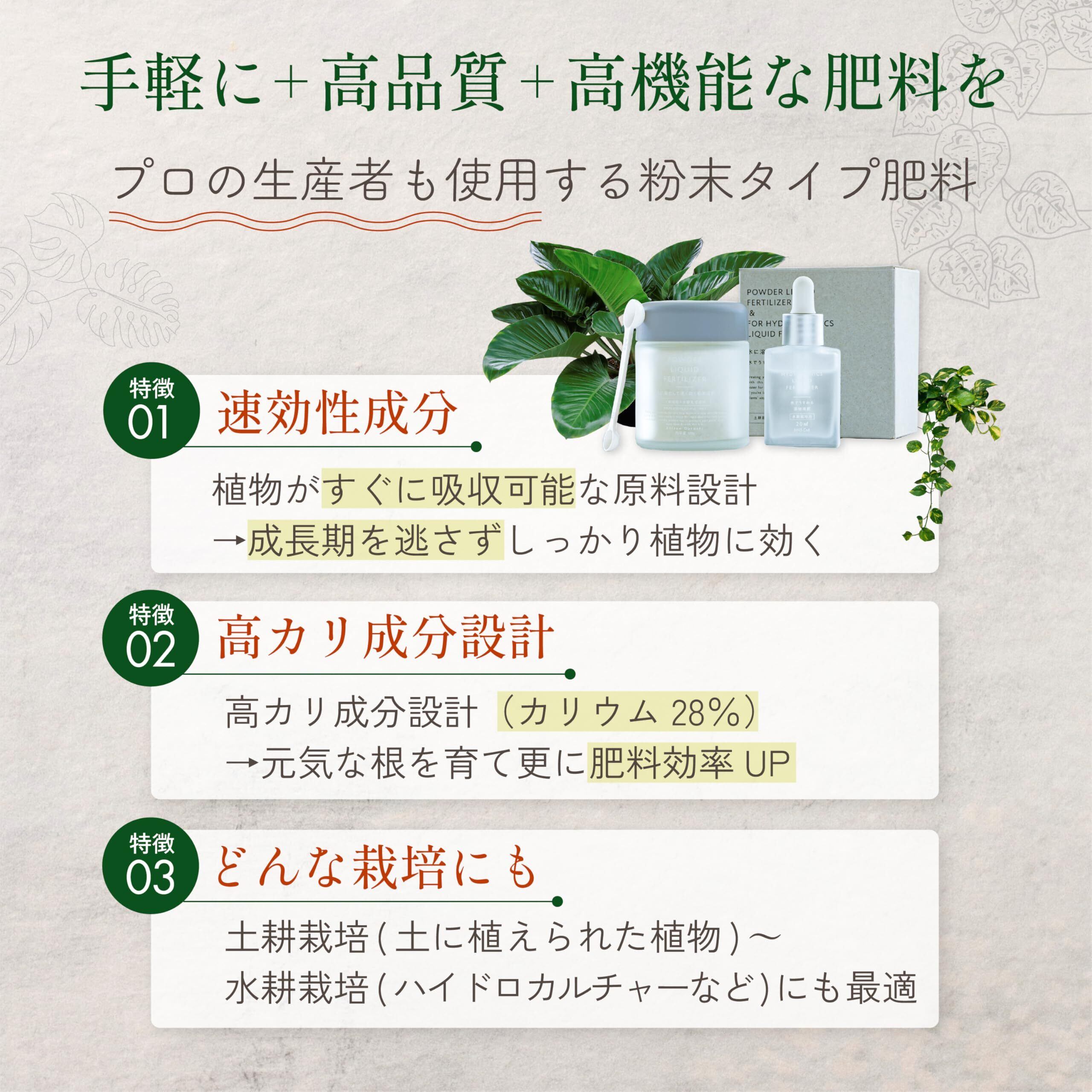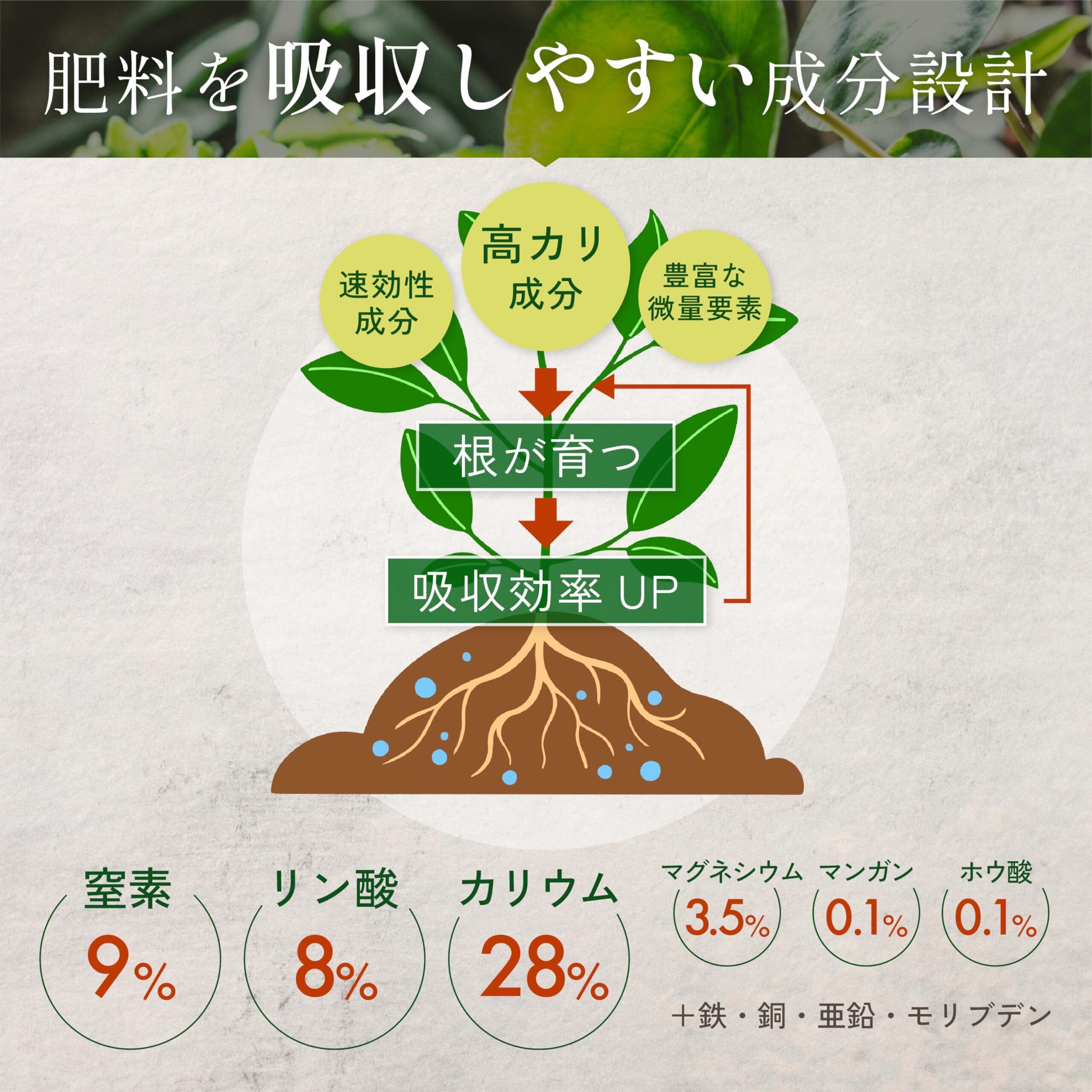 窒素 、 リン酸 、 カリウム 、 マグネシウム 、 微量要素 ( 鉄 ・ 銅 ・ 亜鉛 ・ モリブデン )を1つにまとめた オールインワン 肥料
