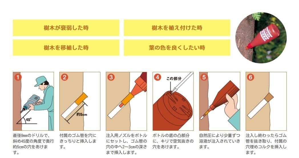 幹に直接挿入するだけで弱った木をスピーディに回復させます。連用による薬害の心配もありません。