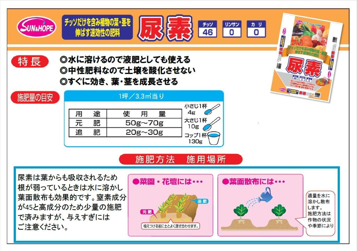 サンアンドホープ 専用肥料 尿素 5kg チッ素だけを含み植物の葉・茎を伸ばす速効性肥料 約50坪分 水に溶けやすい 液肥としても 中性肥料で酸化させない