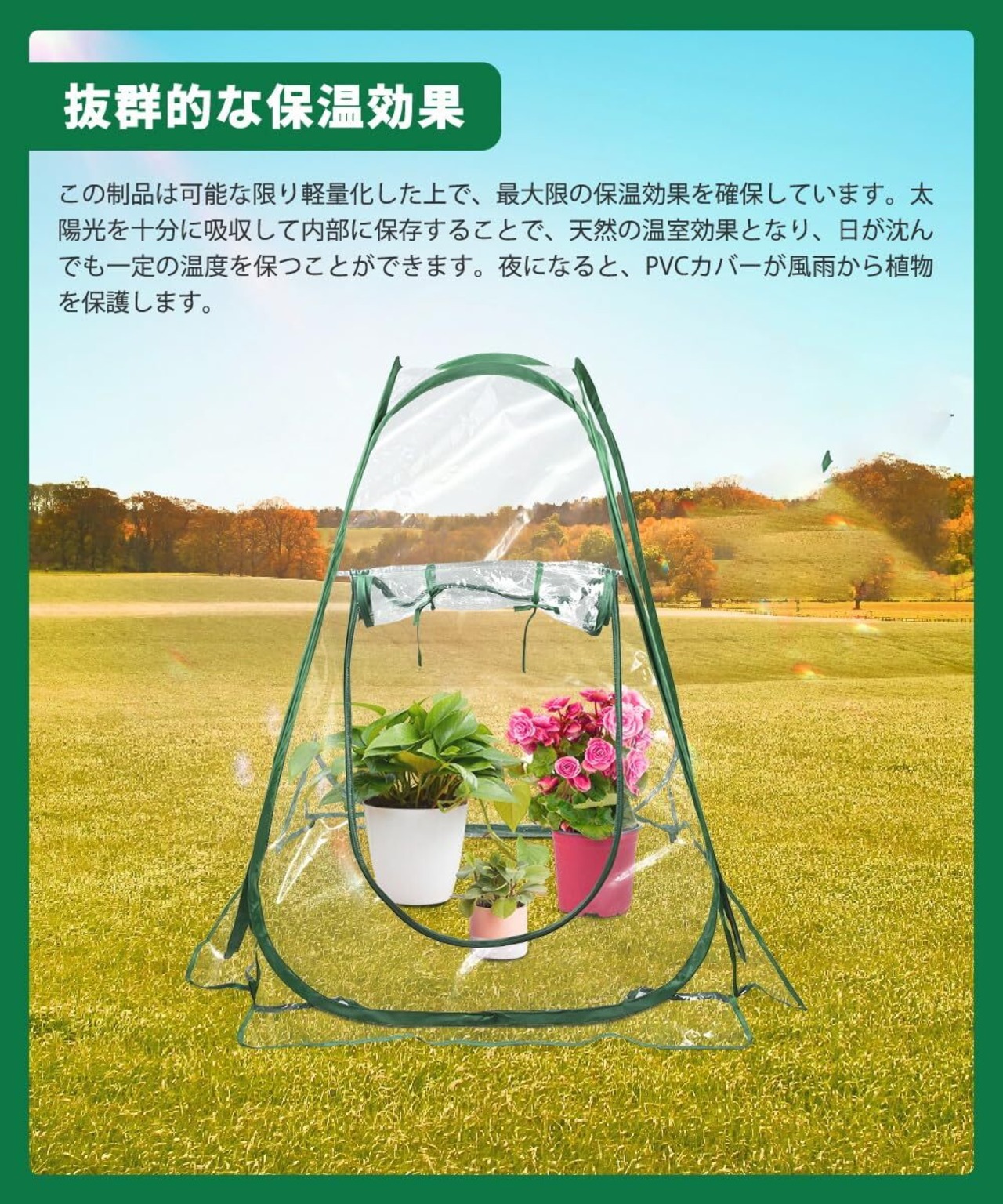 【防雨・防寒・日焼け防止・防虫】夏の過度の日焼けや大雨を防ぎ、冬の防寒保温を行い、異なる季節の需要に適応し、異なる特性の植物に安定した、健康的な生育環境を提供します。さらに、虫や鳥などの啄きを防ぎ、外部の危険から植物を守ります。