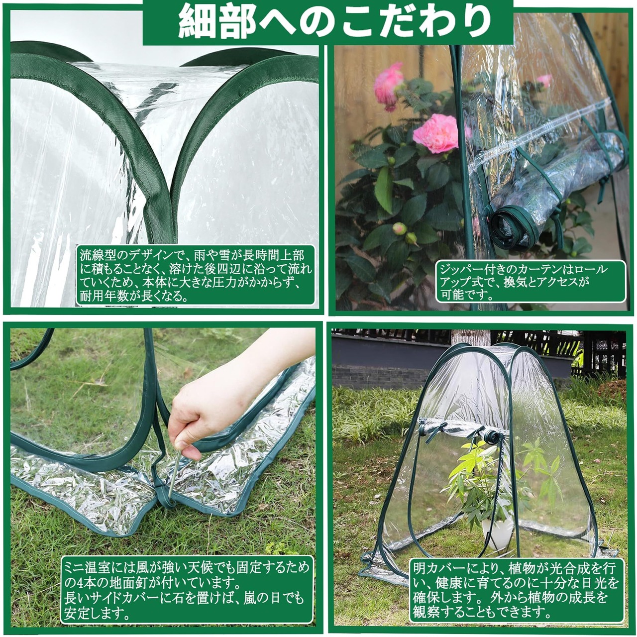 【固定用ピンが四つ付き✚流線型のデザイン】 この小型ビニールハウスには風が強い天候でも固定できる地面釘が4本付いています。長いサイドカバーに石を置けば、嵐の日でも安定します。悪天候でも心配はありません。この小型ビニール温室の上部は流線型のデザインで、雨や雪が長時間上部に積もることなく、溶けた後四辺に沿って流れていくため、本体に大きな圧力がかからず、耐用年数が長くなります。
