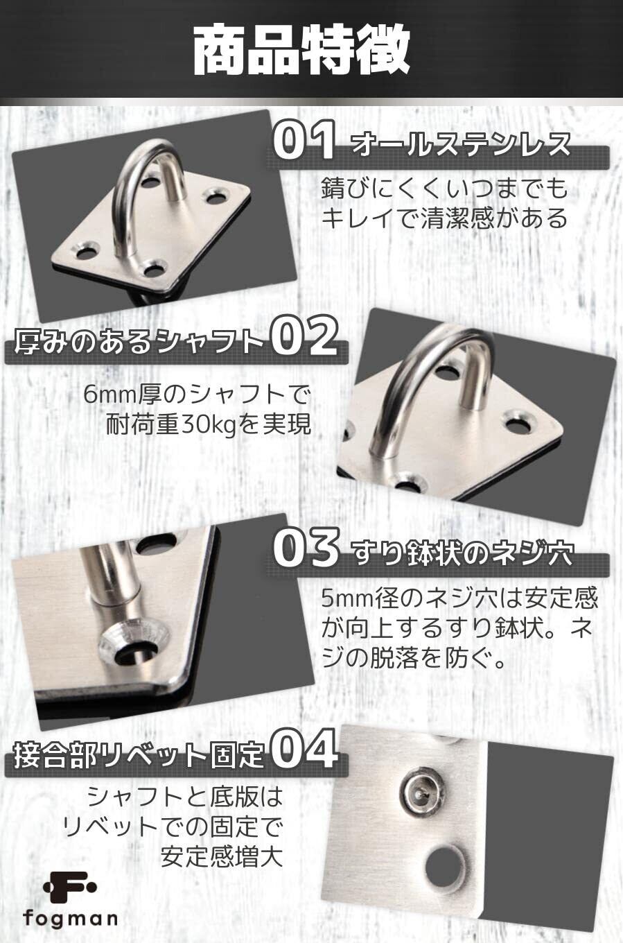 fogman パッドアイ アイプレート 天井フック ステンレス U型 ハンモック ネジ付き 4個セット