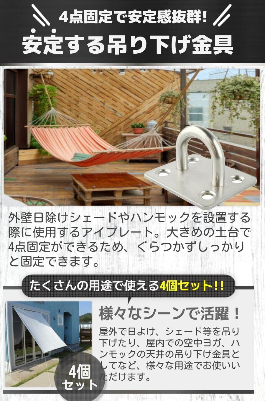 【安定する吊り下げ金具】外壁日除けシェードやハンモックを設置する際に使用するアイプレート。大きめの土台で4点固定ができるため、ぐらつかずしっかりと固定できます。屋外で日よけ、シェード等を吊り下げたり、屋内での空中ヨガ、ハンモックの天井の吊り下げ金具としてなど、様々な用途でお使いいただけます。
