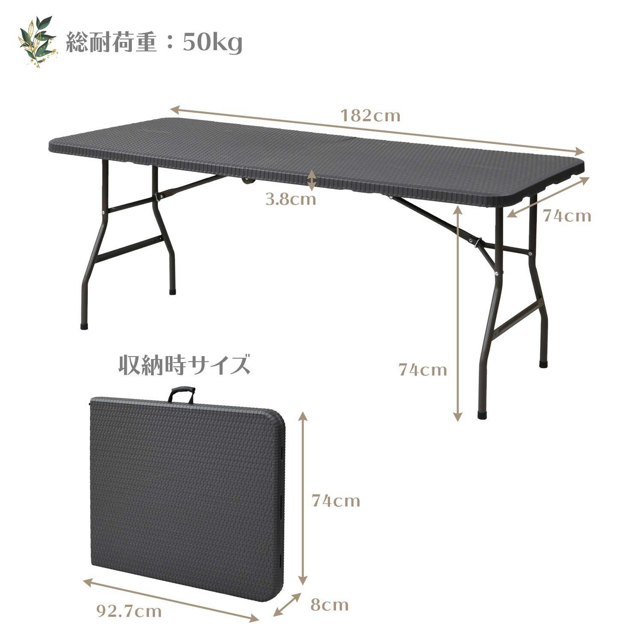 このテーブルは折りたたみ可能です。正しい組み立てと使用方法に従ってください。重さ50kgまでの荷重に耐えます。正しく設置し、固定してください。転倒や倒壊を防ぐために、重い荷物を載せないでください。