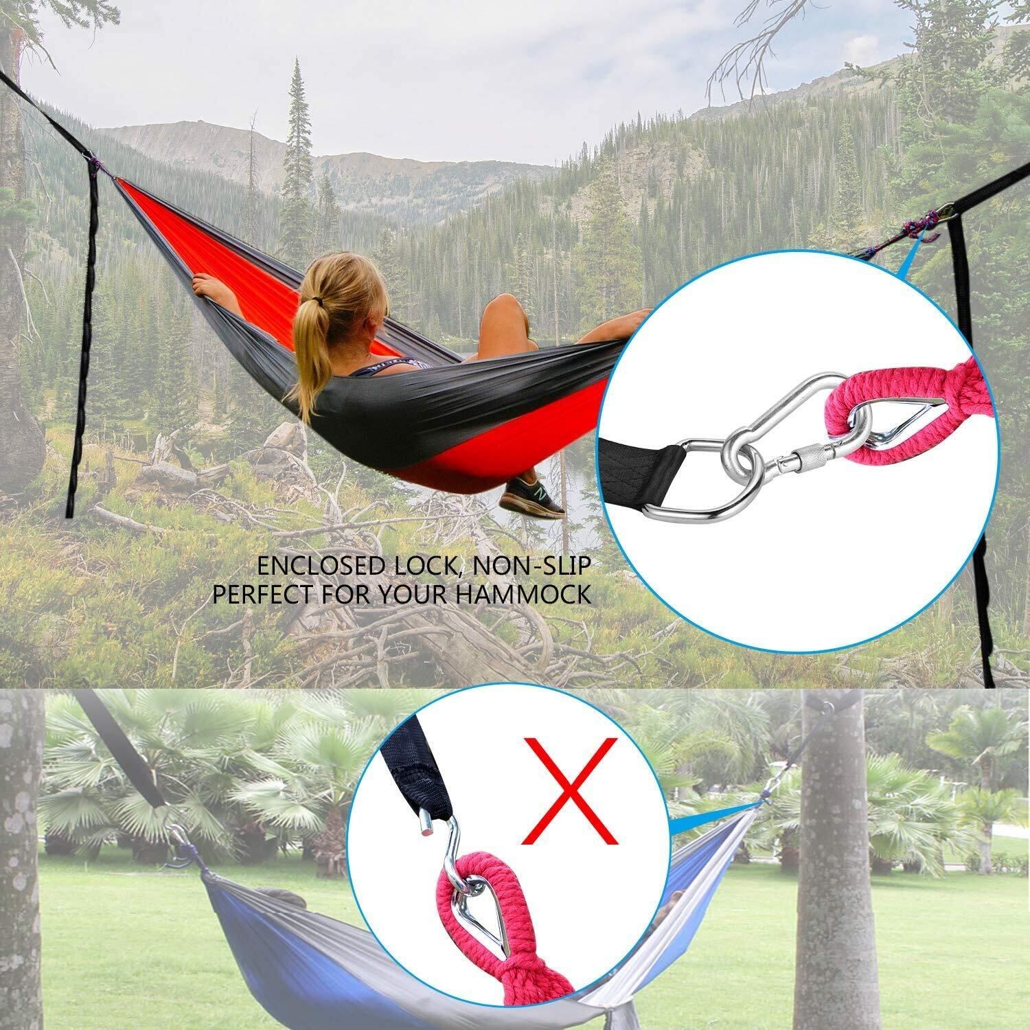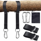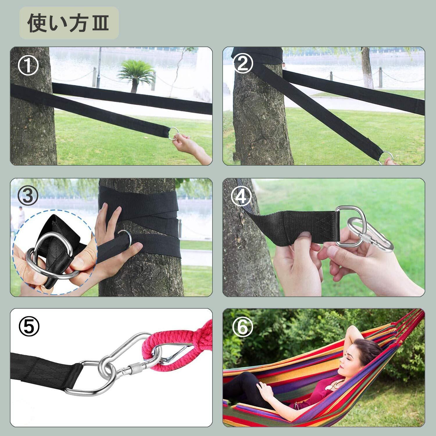 【取り付け簡単】ベルトを木などに数回巻いて、カラビナでベルト両端の金具をロックして固定完了。