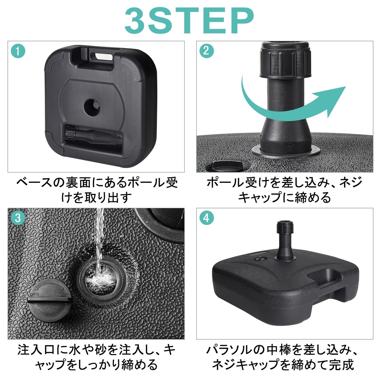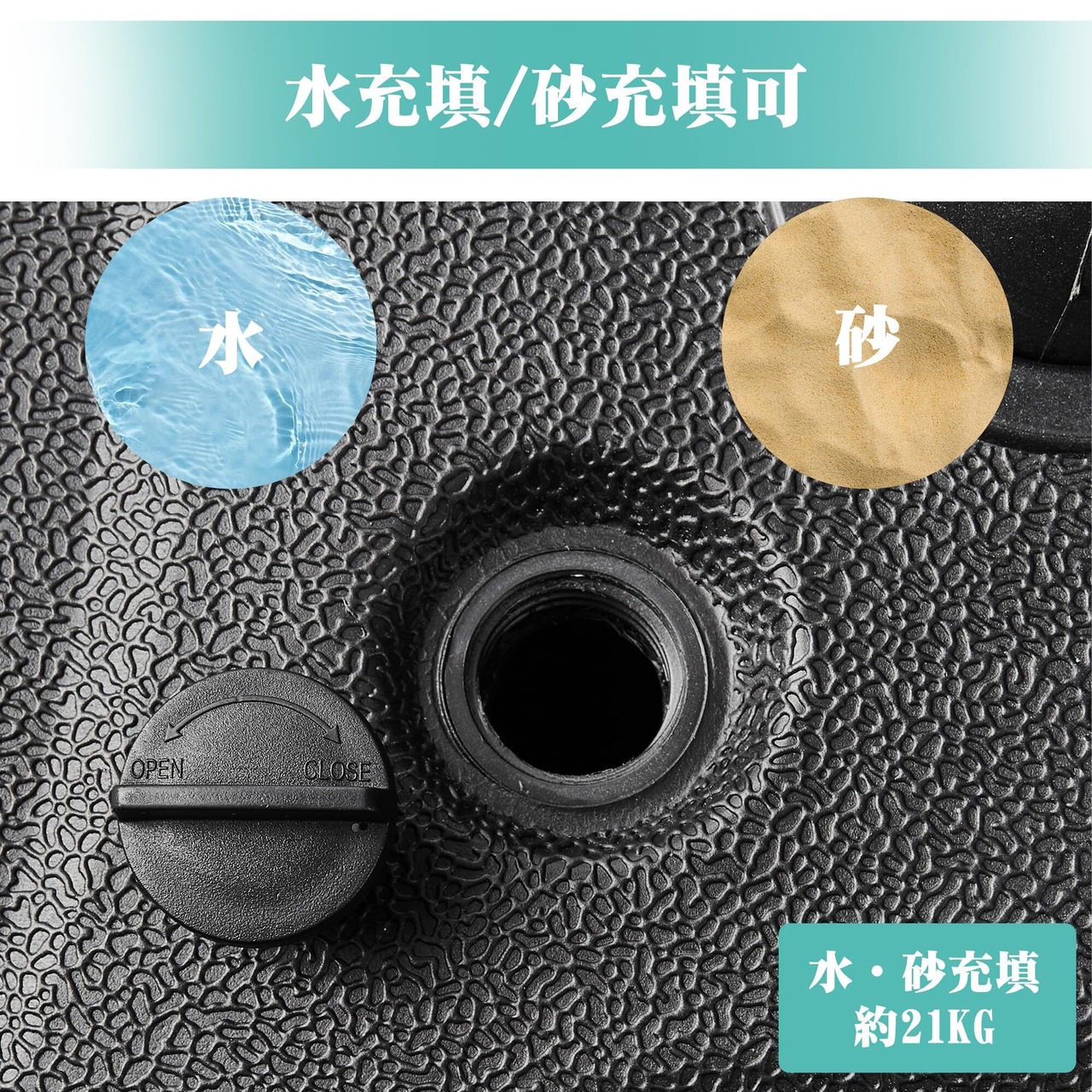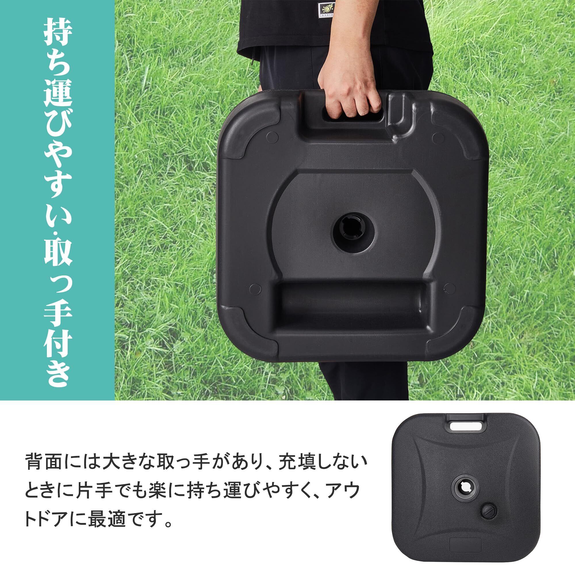 【安定性抜群・風に強い】本社のパラソルベースはパラソルをしっかり固定し、パラソルを安全に使えるための必需品です。21KGの水や砂を注入し、安定性が優れており、風に強いです。