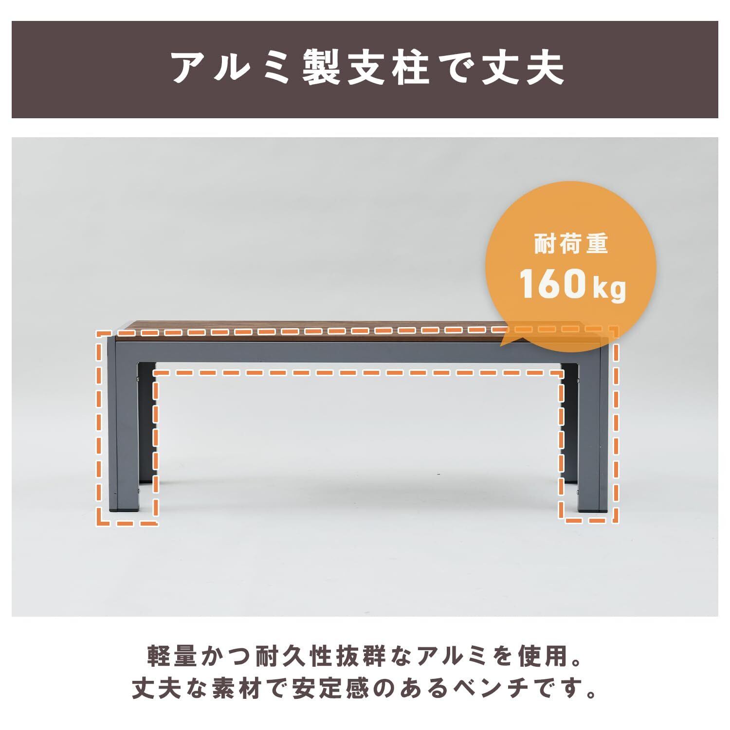【仕様】本体サイズ:幅120.5×奥行34.2×高さ43cm/重量:8.3kg/材質:(座部)=ポリスチレン、(構造部材)=アルミ/カラー:ダークブラウン