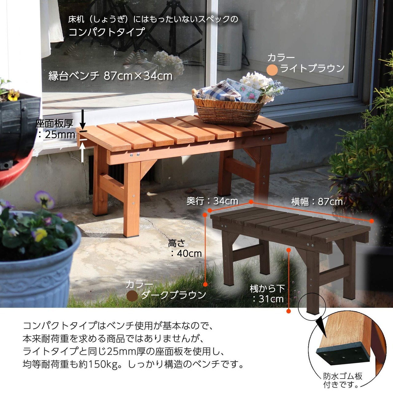 サイズ: [縁台] 幅87cm×奥行34cm×高さ40cm ベンチ部(座面)板厚25mm 座面下31cm