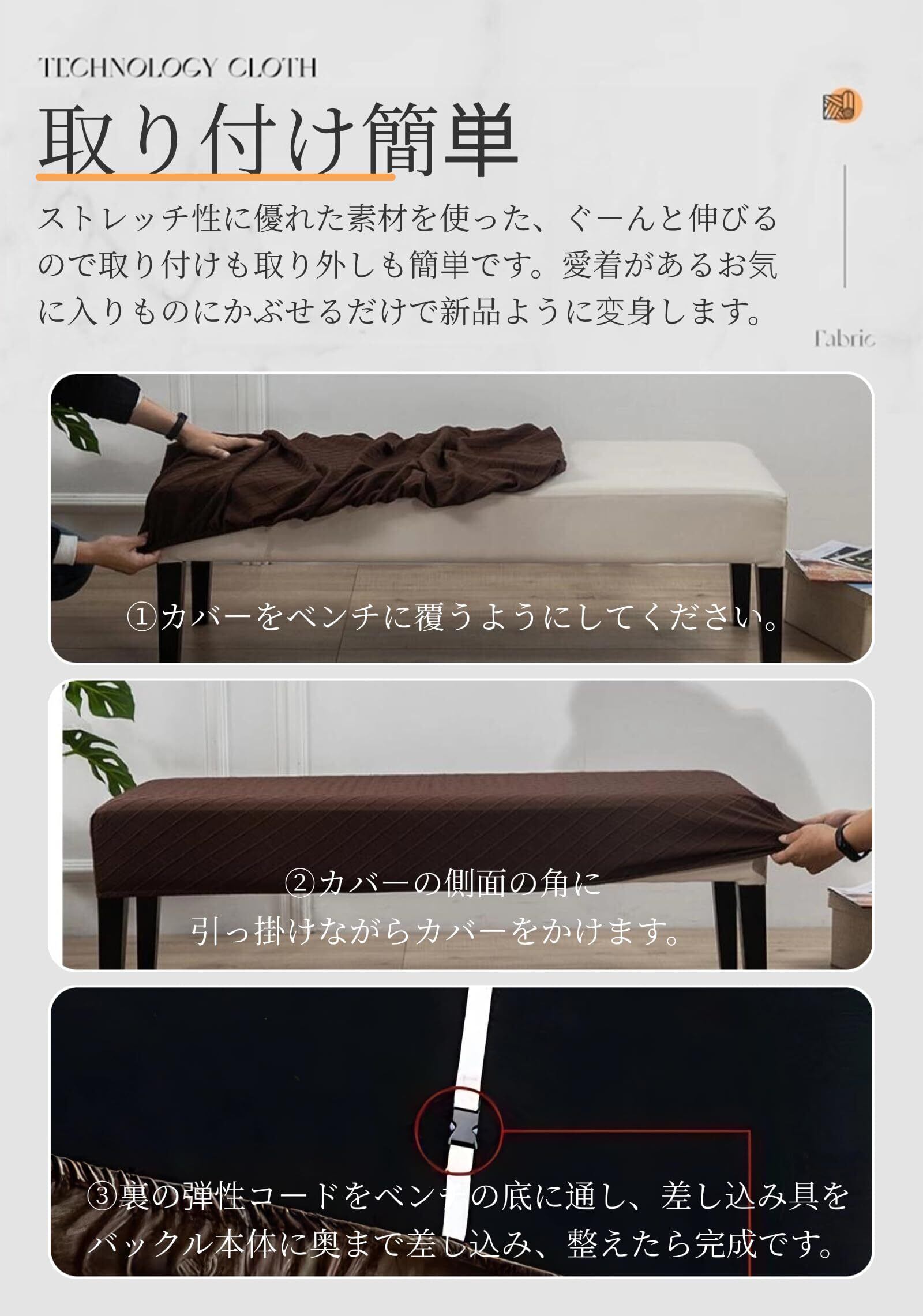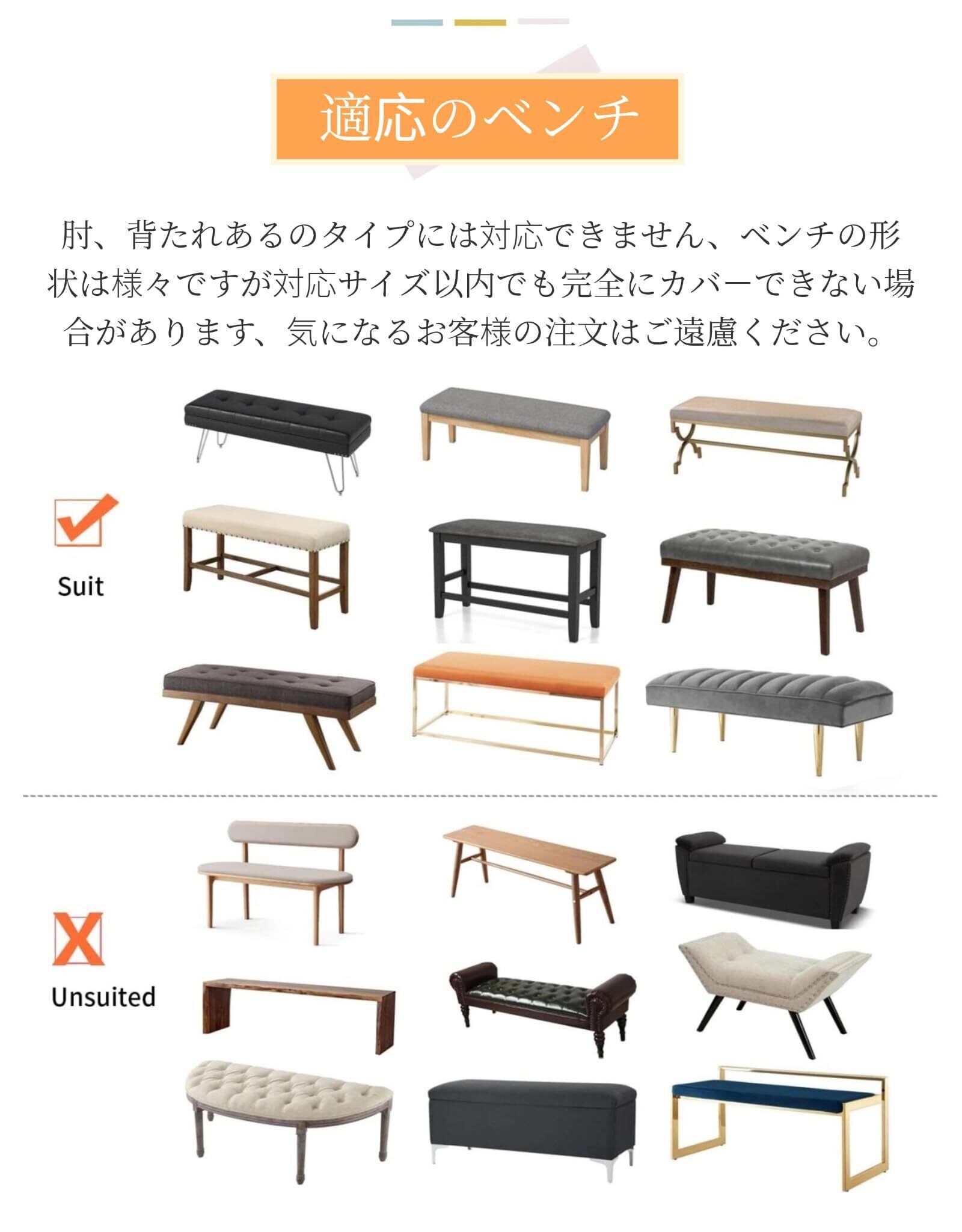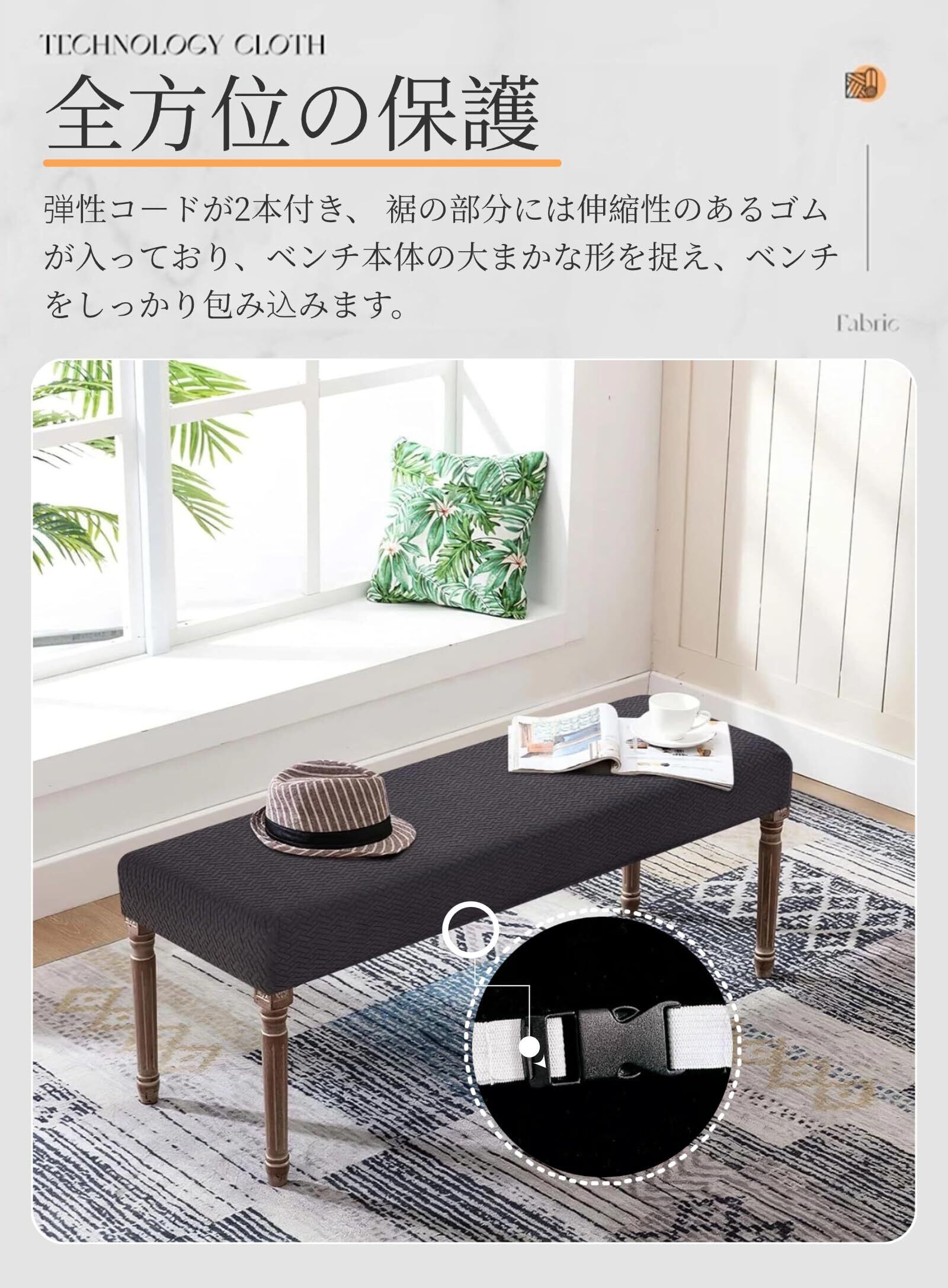 【優れたストレッチ性&全方位の保護】優れた伸縮性のある生地(ポリエステル95%、スパンデックス5%)で様々なサイズの椅子にフィットし、装着も脱着も非常に簡単、女性一人の力でも問題なし。横幅110-120cm、奥行38-43cm、厚さ8-12cm以内の座面に対応可能!全方位しっかり保護して、新しいファッション感あるベンチに変えられます。 ベンチカバー裏面には弾性のある紐付き、伸縮性が高い、ベンチ本体の大まかな形を捉え、ベンチをしっかり包み込みます。