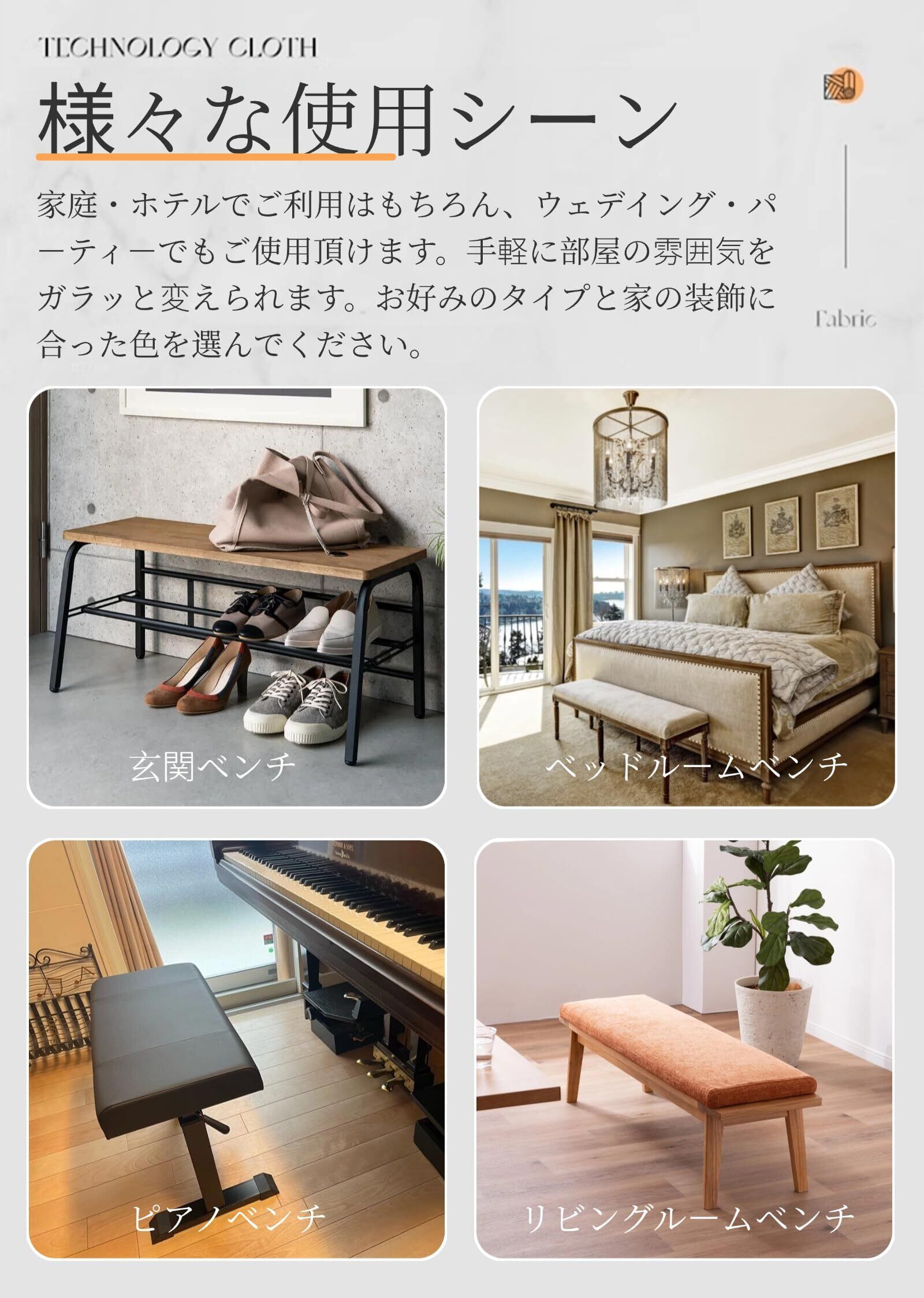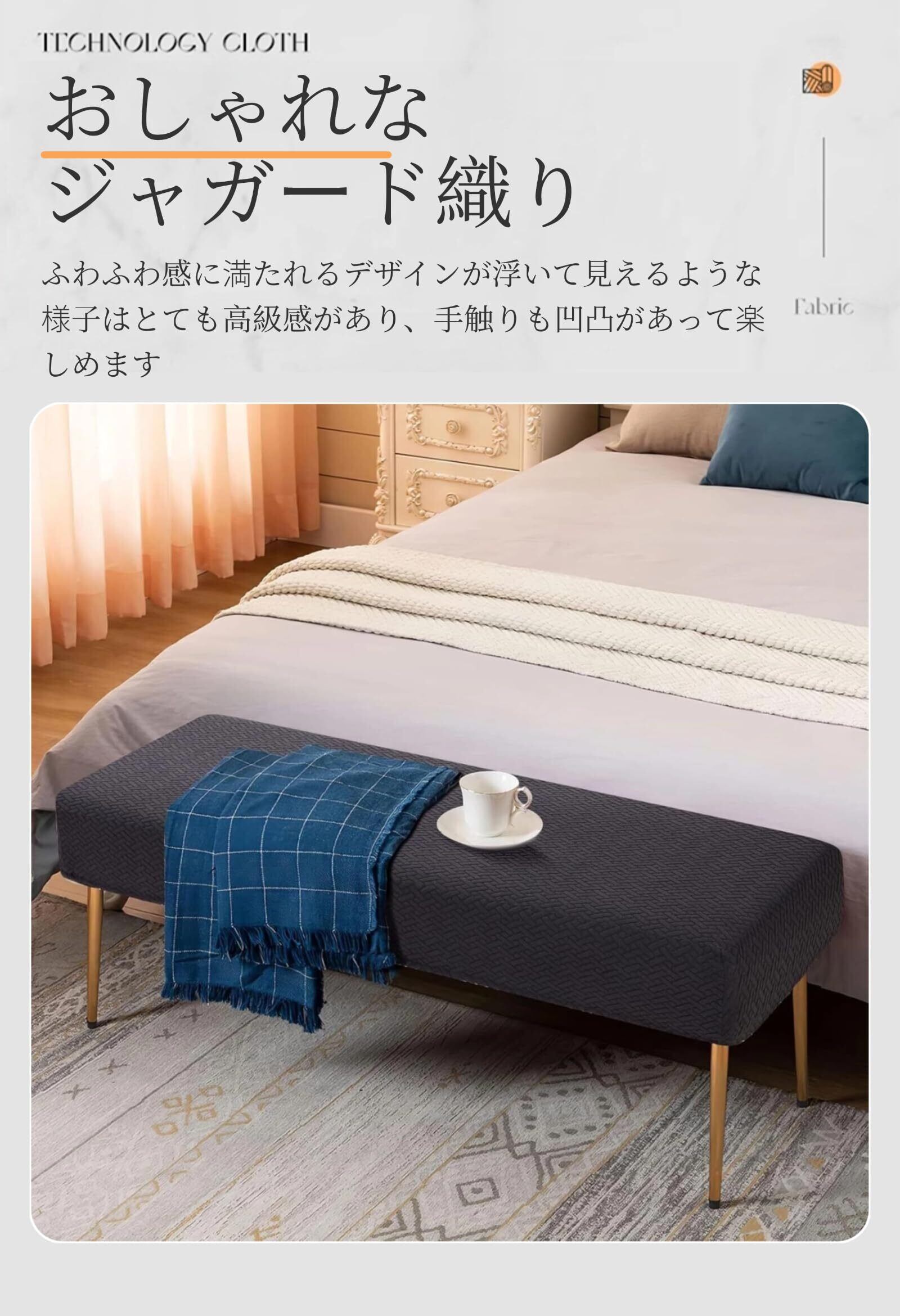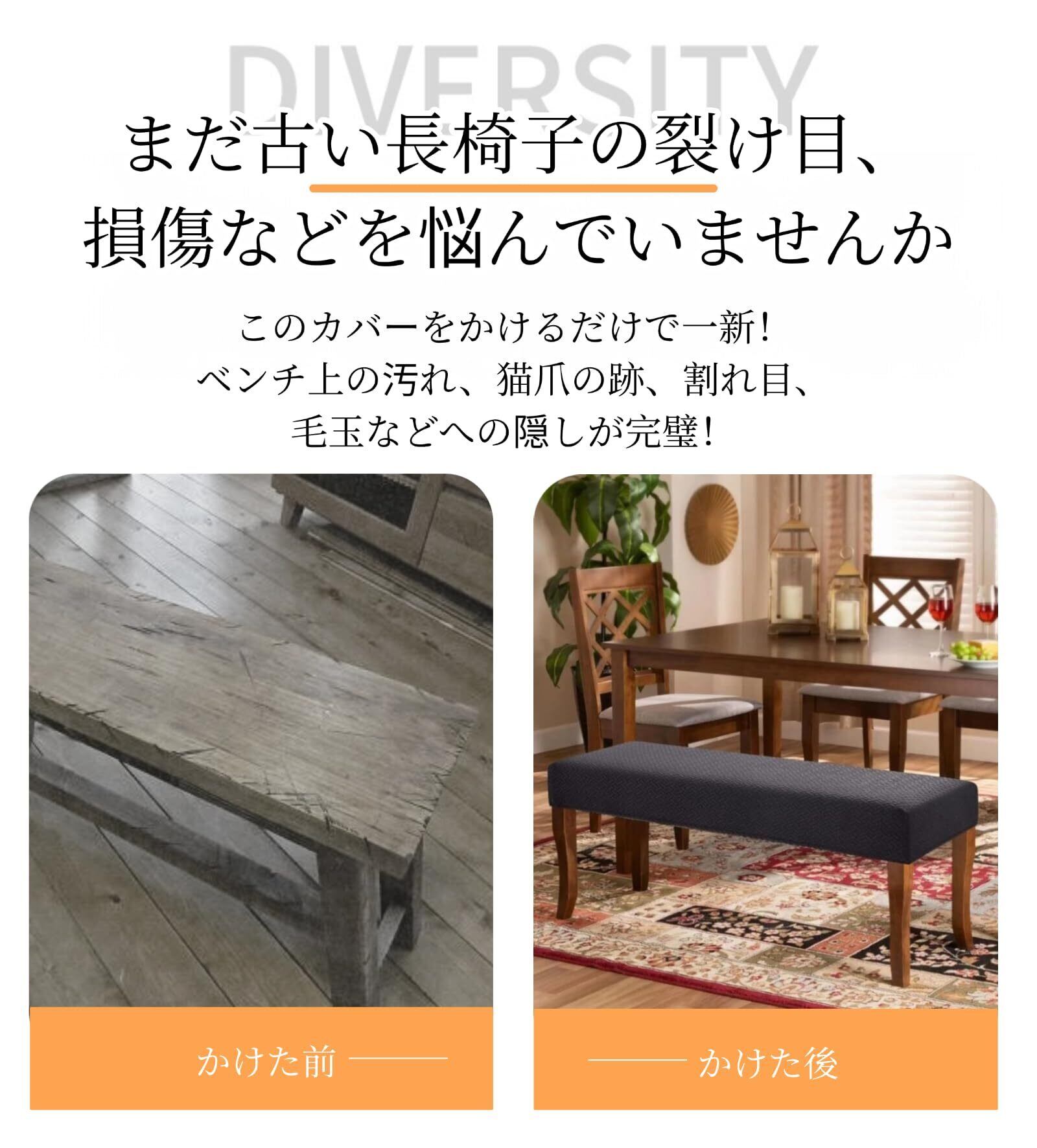 【優れたストレッチ性&全方位の保護】優れた伸縮性のある生地(ポリエステル95%、スパンデックス5%)で様々なサイズの椅子にフィットし、装着も脱着も非常に簡単、女性一人の力でも問題なし。横幅110-120cm、奥行38-43cm、厚さ8-12cm以内の座面に対応可能!全方位しっかり保護して、新しいファッション感あるベンチに変えられます。 ベンチカバー裏面には弾性のある紐付き、伸縮性が高い、ベンチ本体の大まかな形を捉え、ベンチをしっかり包み込みます。