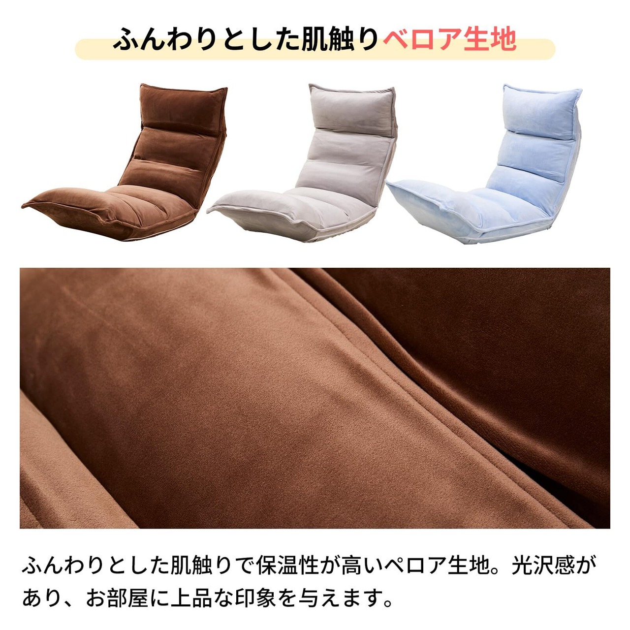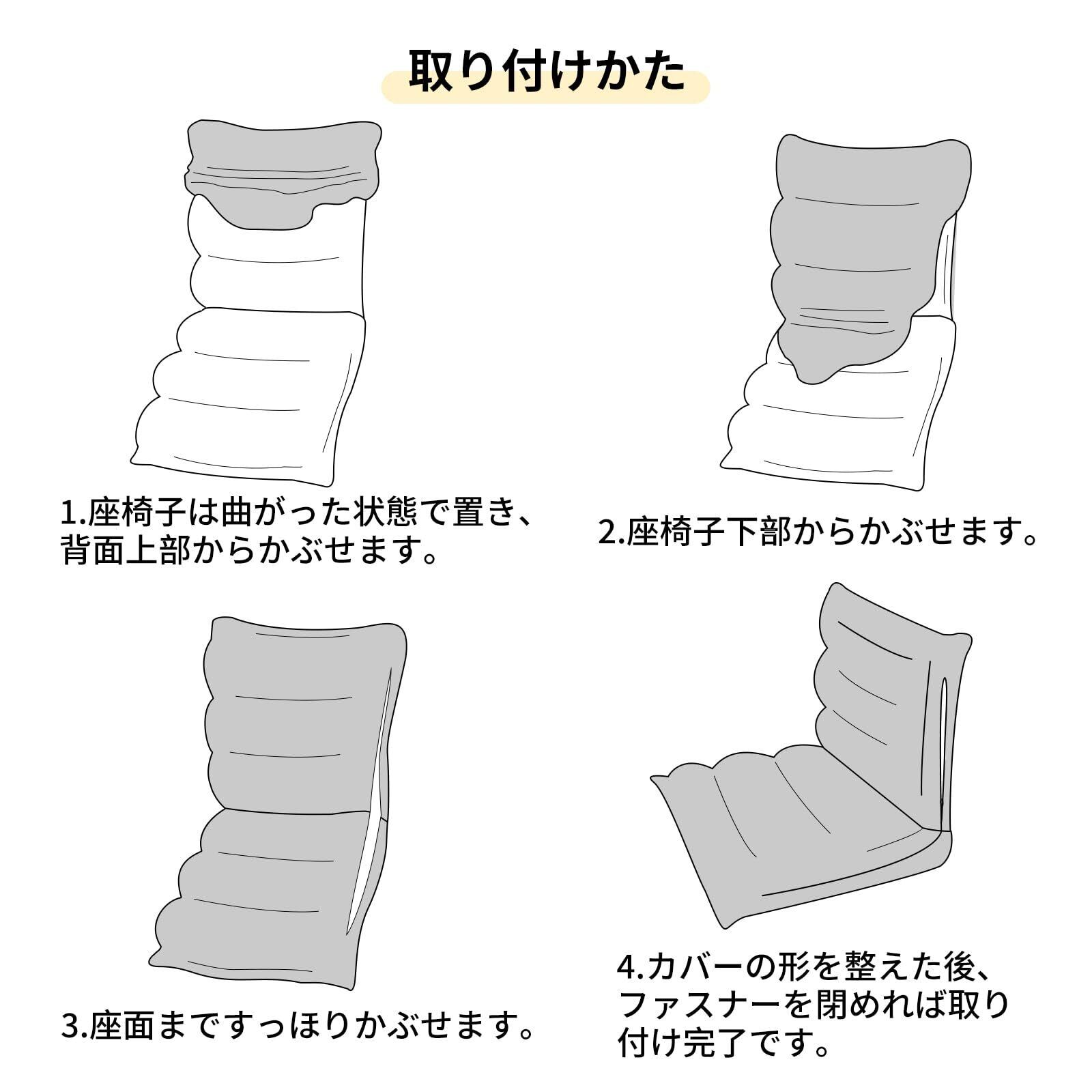 ・ふんわりとした肌触りで保温性が高いぺロア生地を採用して、光沢感があり、お部屋に上品な印象を与えます。 ・カバーリングなので、自由に洗濯ができて、いつでも清潔にご利用が可能です。汚れが気になる方にお勧めします。 ・伸縮できる生地で、簡単にかぶせるだけで、クッションにフィットします。 ・隠しファスナーを利用し、床を傷つく心配がなく、耐久性にも優れています。 ・三色で選択できなすので、お気に入る色の座椅子を作りましょう。