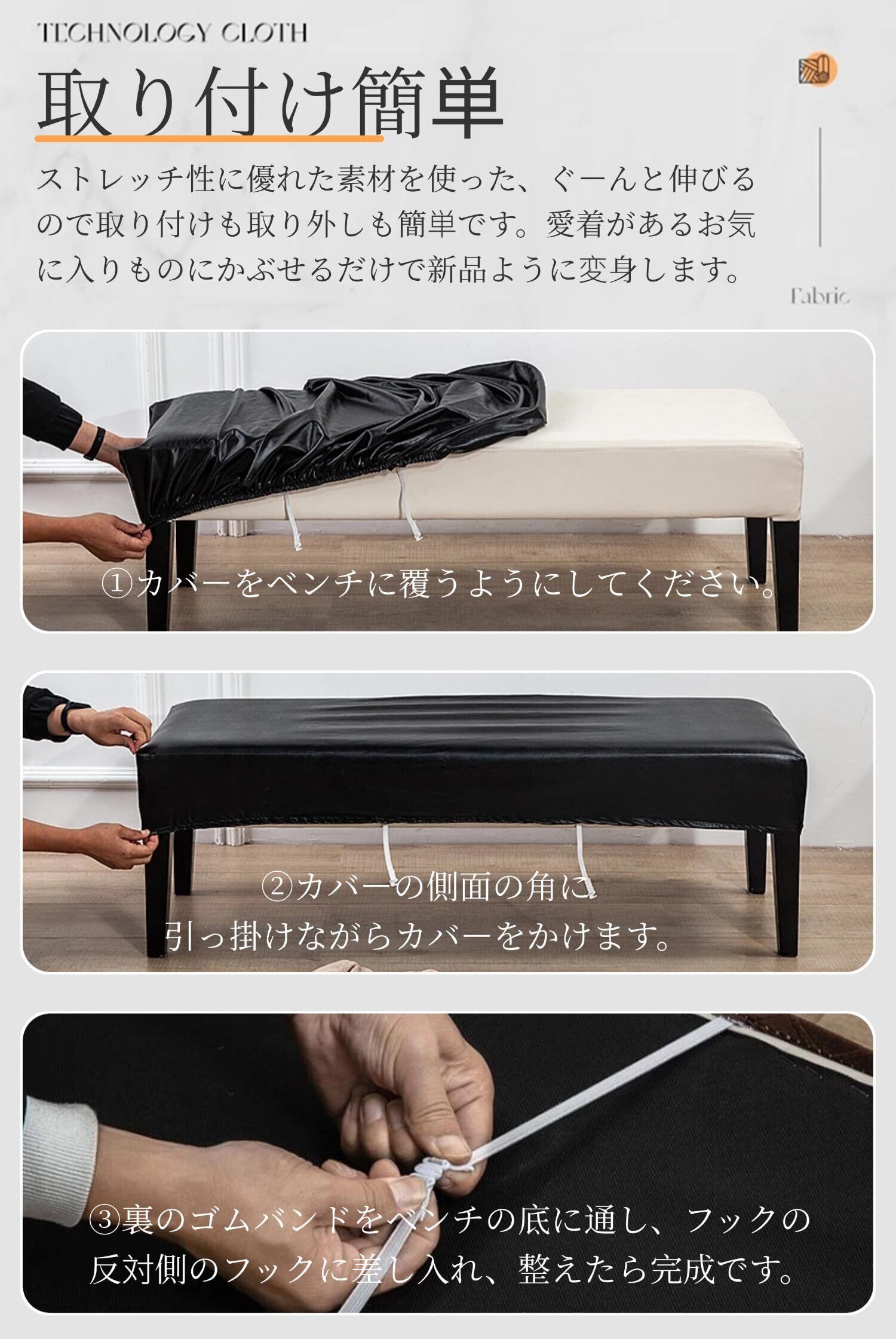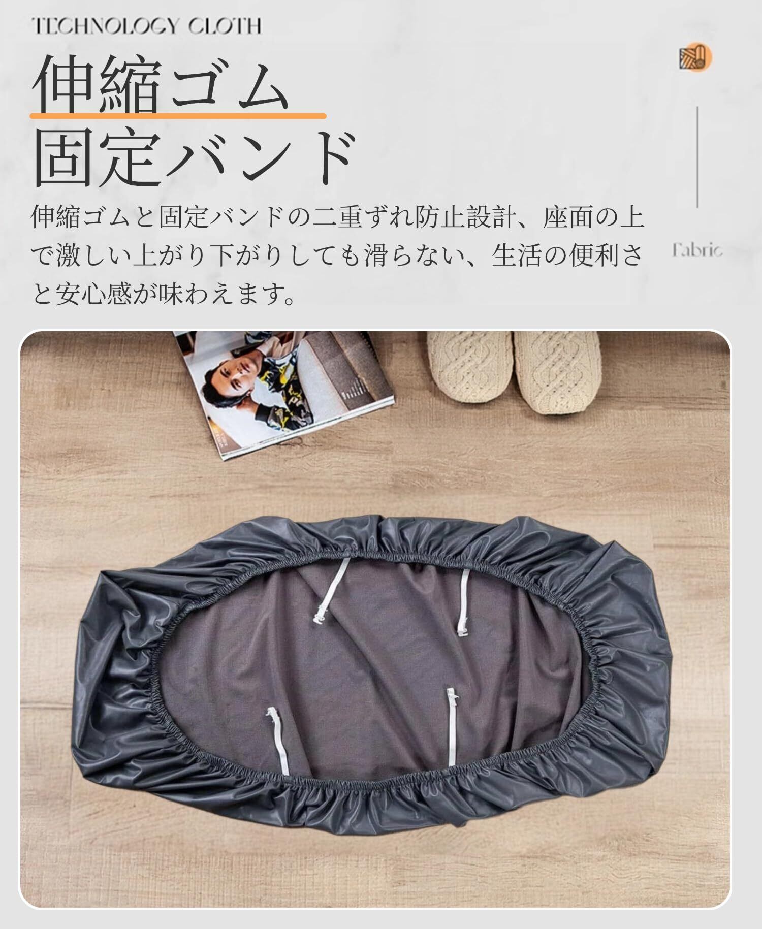 「二重固定・ズレない」下に丈夫なゴムが一周つけられているおかげで、ベンチを完璧でしっかりと包んでおり、ベンチ座面の上で激しい上がり下がりしても滑らないです。また従来のひもで締める方法が改善され、伸縮ゴムとバックル留めの二重ずれ防止設計、サッと取り付け可能、面倒なボタンなどの手間いらず、ベンチにもより 良くフィットし、設置もより便利になります。