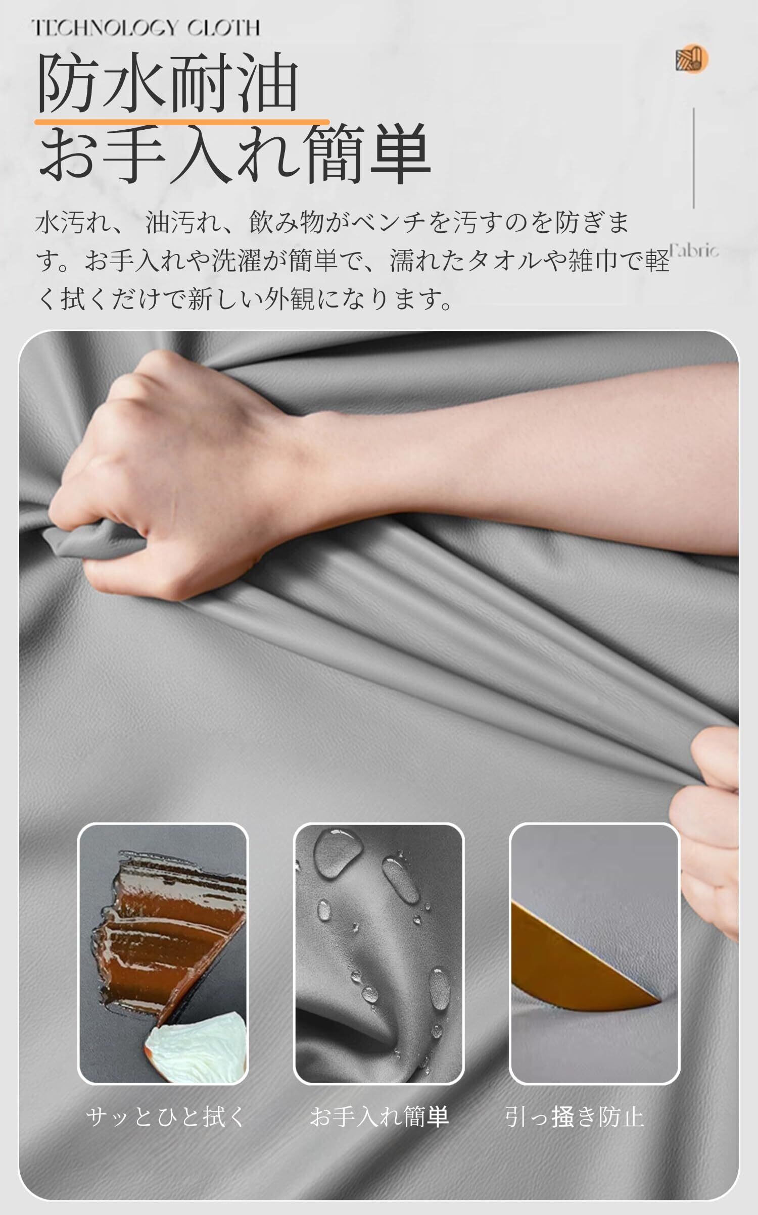 「伸びる高品質なPU素材&防水耐油」PUレザーの素材を採用し、高弾性で耐久性があり、しっかりとフィット縫い付けられ、ほつれなく、長くご愛用頂けます。水汚れ、 油汚れ、飲み物がベンチを汚すのを防ぎます。ベンチカバーはお手入れや洗濯が簡単で、濡れたタオルや雑巾で軽く拭くだけで新しい外観になります。