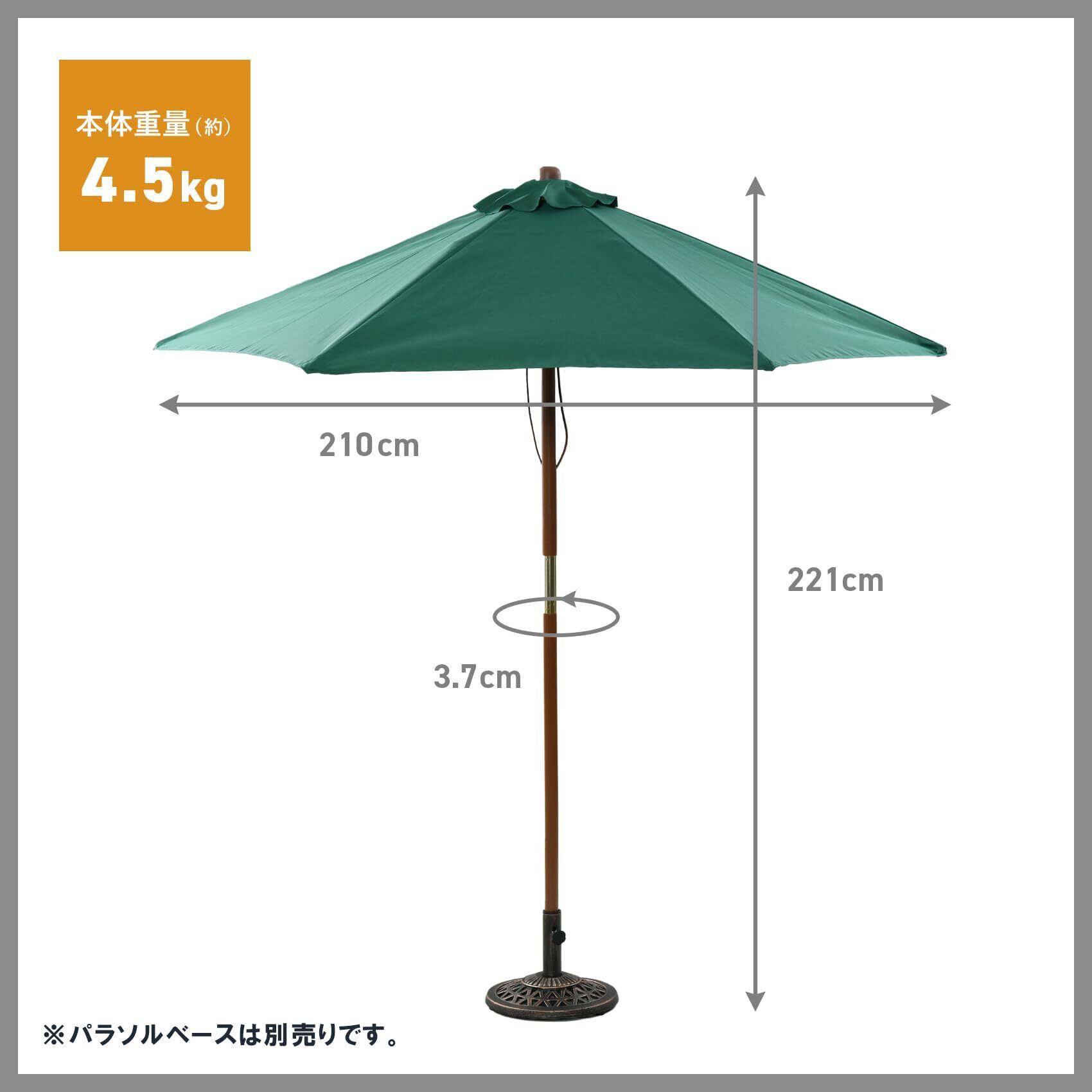 【仕様】本体サイズ:幅210×奥行210×高さ221cm、支柱径:3.7cm/重量:4.5kg/材質:支柱=天然木、生地=ポリエステル/カラー:グリーン