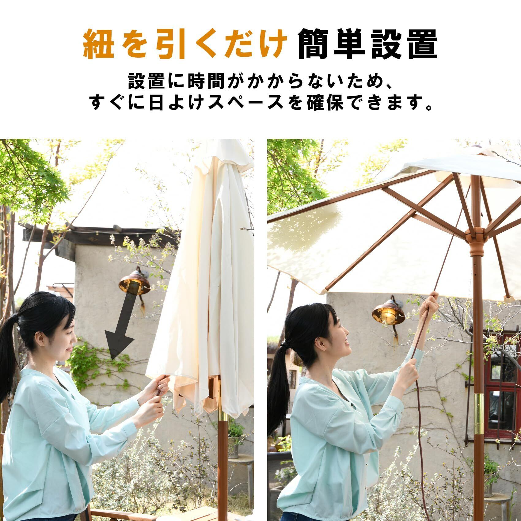 【簡単設置】日除けに便利な木製パラソル。紐を引くだけで簡単に設置できる。