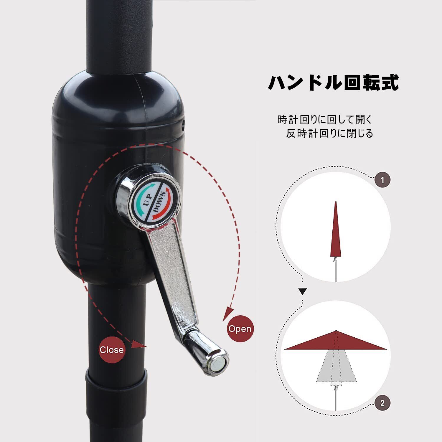使用簡単:アルミ製の支柱は木製パラソルと比べると軽くて、力に自信のない方でも比較的楽に持ち運びや設置することができます。パラソルの開閉には、普通の傘とは違いハンドル式を採用、クルクルと回すだけで開閉できるので、これほど大きなパラソルでも女性一人で簡単に開閉できます。