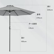 製品仕様:【色】ブラウン 【傘骨】8本 【組立時サイズ(約)】 直径270x高さ235cm【重量(約)】4.76kg 【 ポールの直径(約)】38mm 【傘生地】100%ポリエステル(200g/m²) 【骨組み】Al-Fe合金(合金骨組みは粉体塗装)