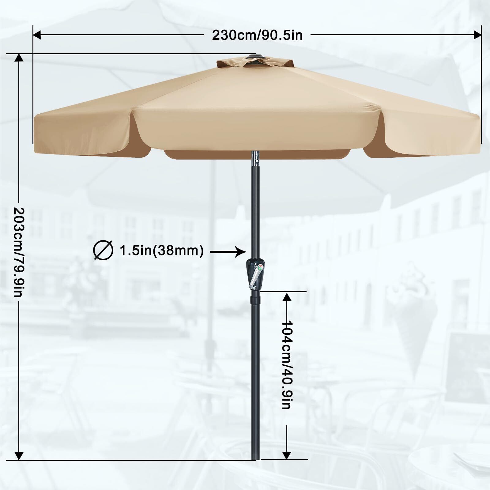 商品仕様:【サイズ】直径230cmx高さ203cm/ポールの直径38mm。【材質】骨組み:合金鋼/生地:ポリエステル。【傘骨】6本。