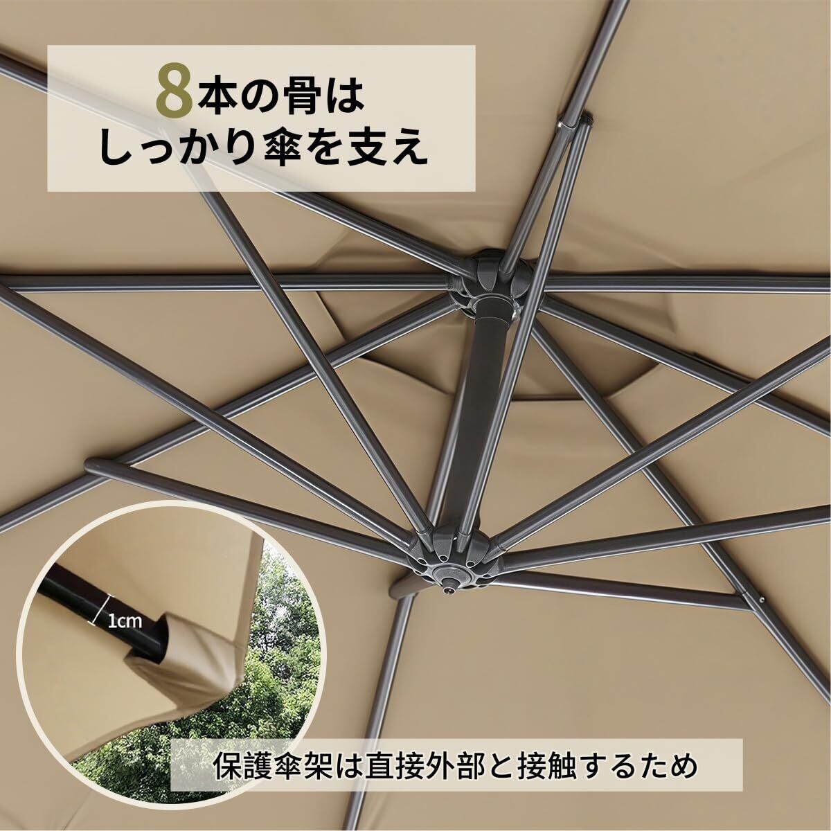 ️【高品質素材】このパラソルは高強度のアルミが採用され、錆びにくく、耐久性も優れています。8本の骨はしっかり傘を支え、風速が強い日でも、安心して使用できるため。そして傘布の表面はスプラッシュ防止処理が施されています、これは、防雨、日焼け止め、紫外線、カビ、及び高温耐性の特性を有しています。