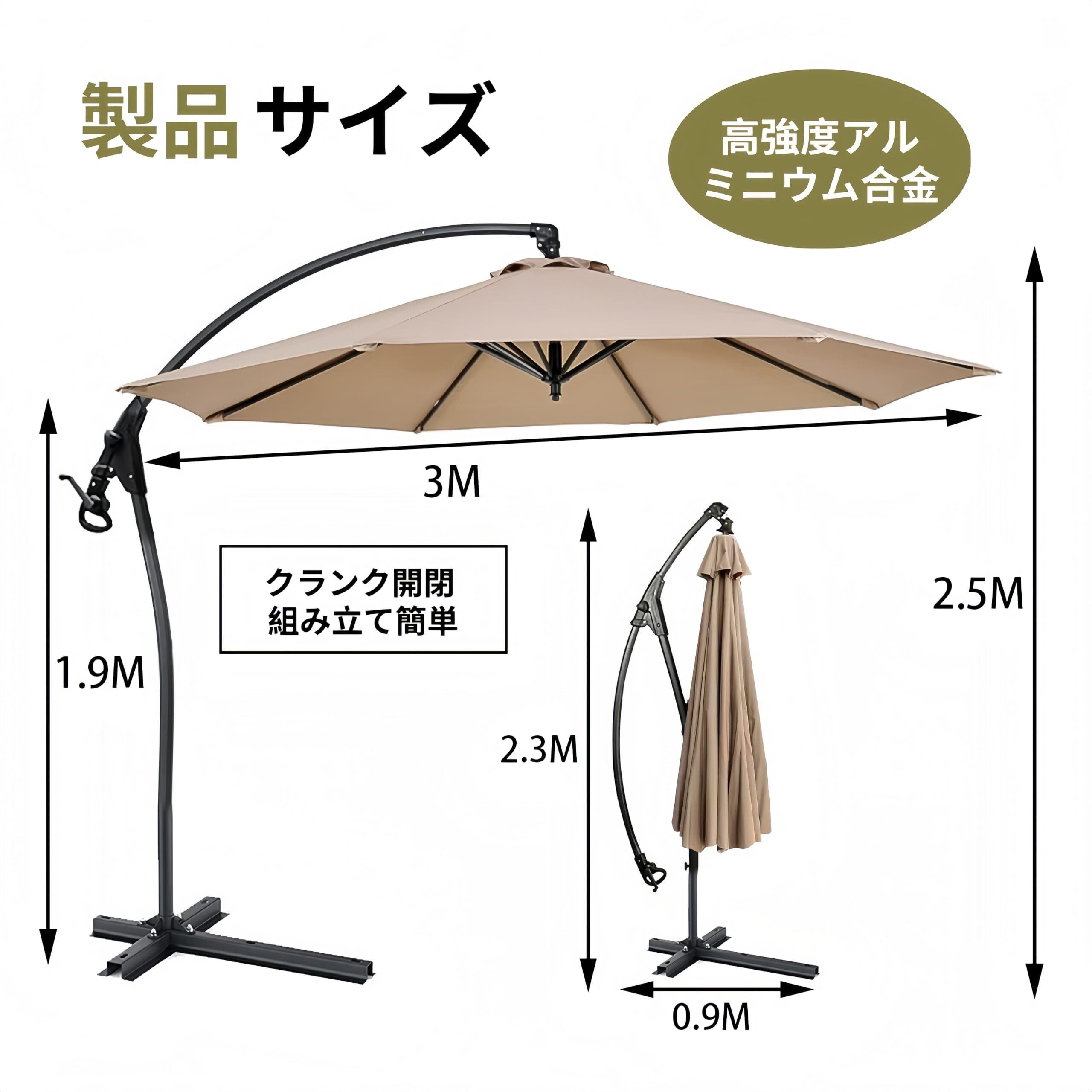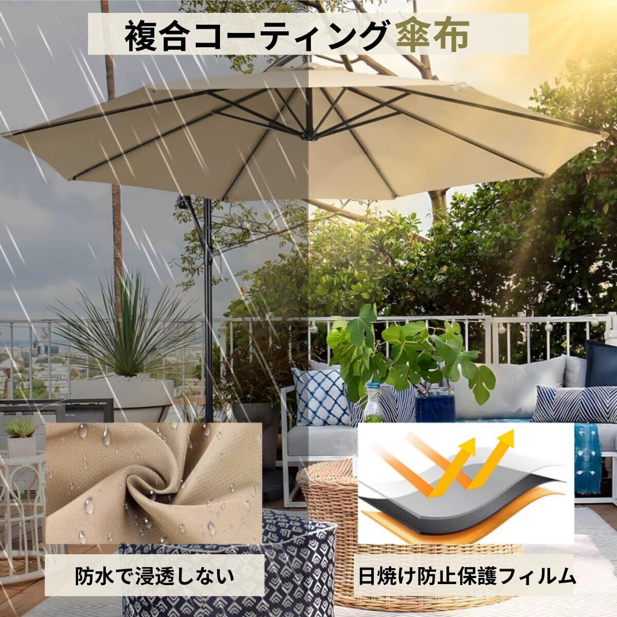 ガーデンパラソル ビーチパラソル アルミ 直径300cm 大型 吊り下げ式 日傘 クランク開閉 角度調整可能 傘カバーと十字架ベース付き 風に強い UVカット 撥水 庭、公園、ビーチ、テラス、カフェ、屋外イベントに最適 日本語説明書付き