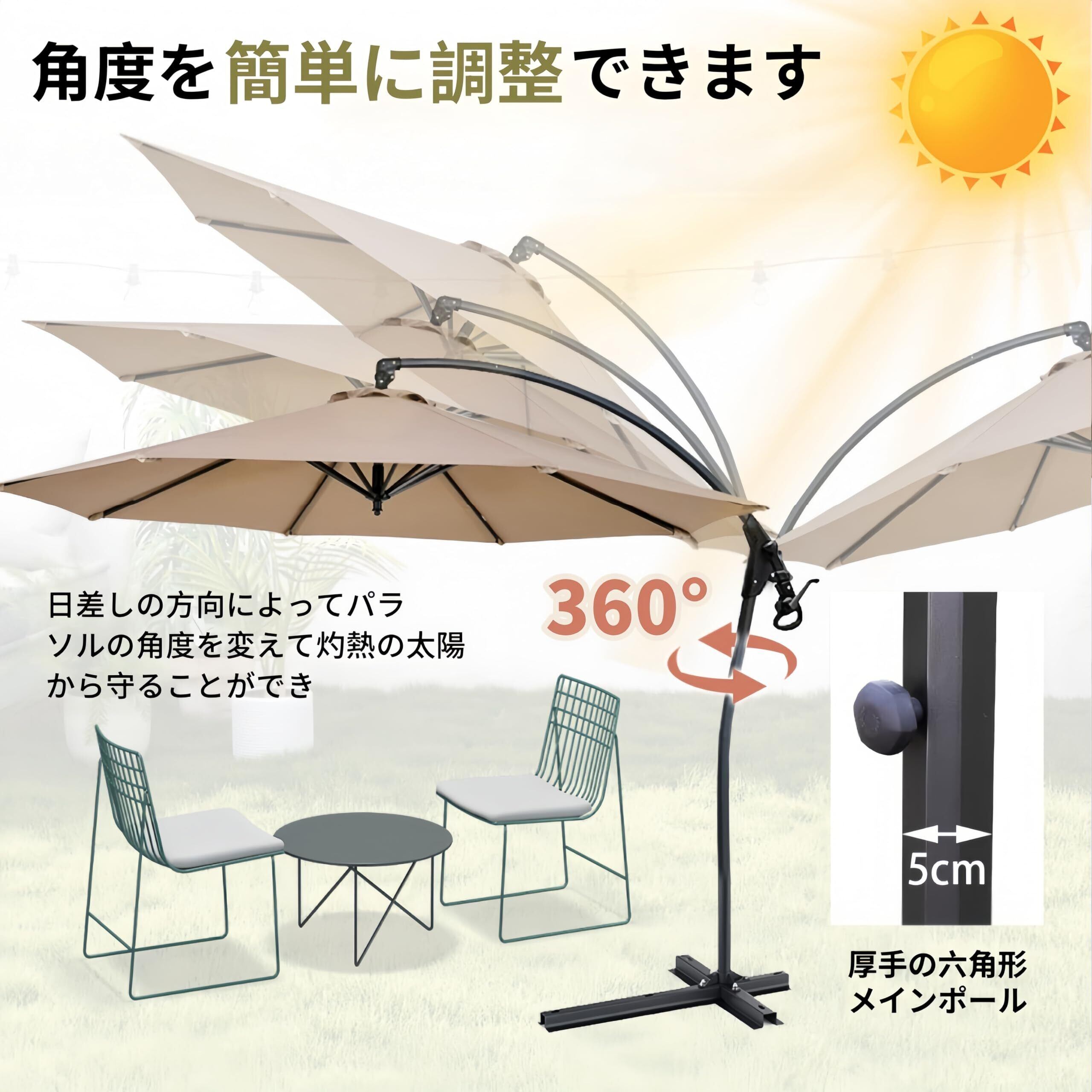 ️【簡単調整機能】ガーデンパラソルの角度は上下または左右で調節可能です。日差しの方向によってパラソルの角度を変えて灼熱の太陽から守ることができ、日焼けから肌の健康を守る。