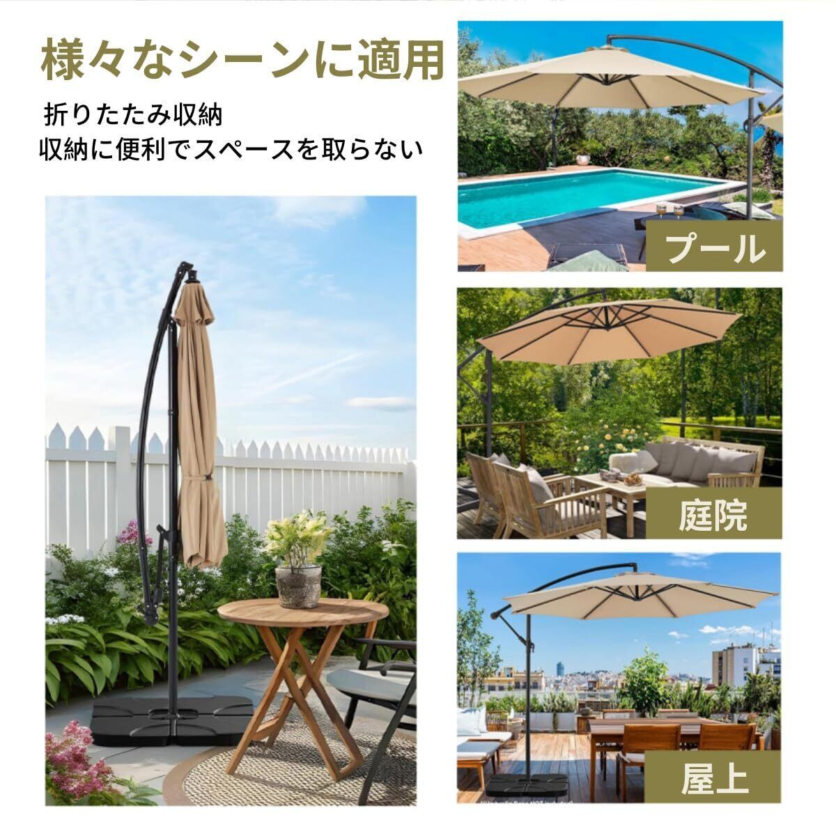 ️【様々なシーンに適用】直径3mのガーデンパラソル、柱が真ん中にないので、中央の空間を存分に活用できます。庭やバルコニーだけでなく、ビーチ、アウトドアイベント、カフェのテラスにも最適です。遮光遮熱効果も良し、猛暑の暑さから離れる日除けの場を作れます。
