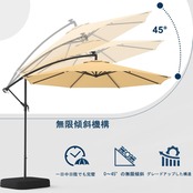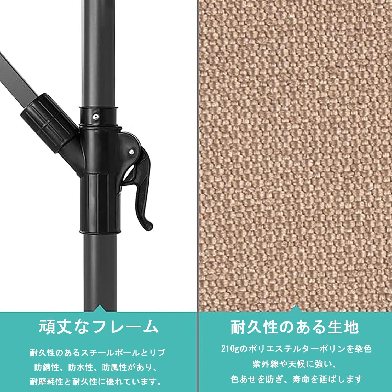 簡単なクランク/傾斜調整: スムーズなクランク システムにより、パラソルの開閉 (時計回り) が数秒で簡単に行えます。傾き調整により、シェードは常に希望の位置になります