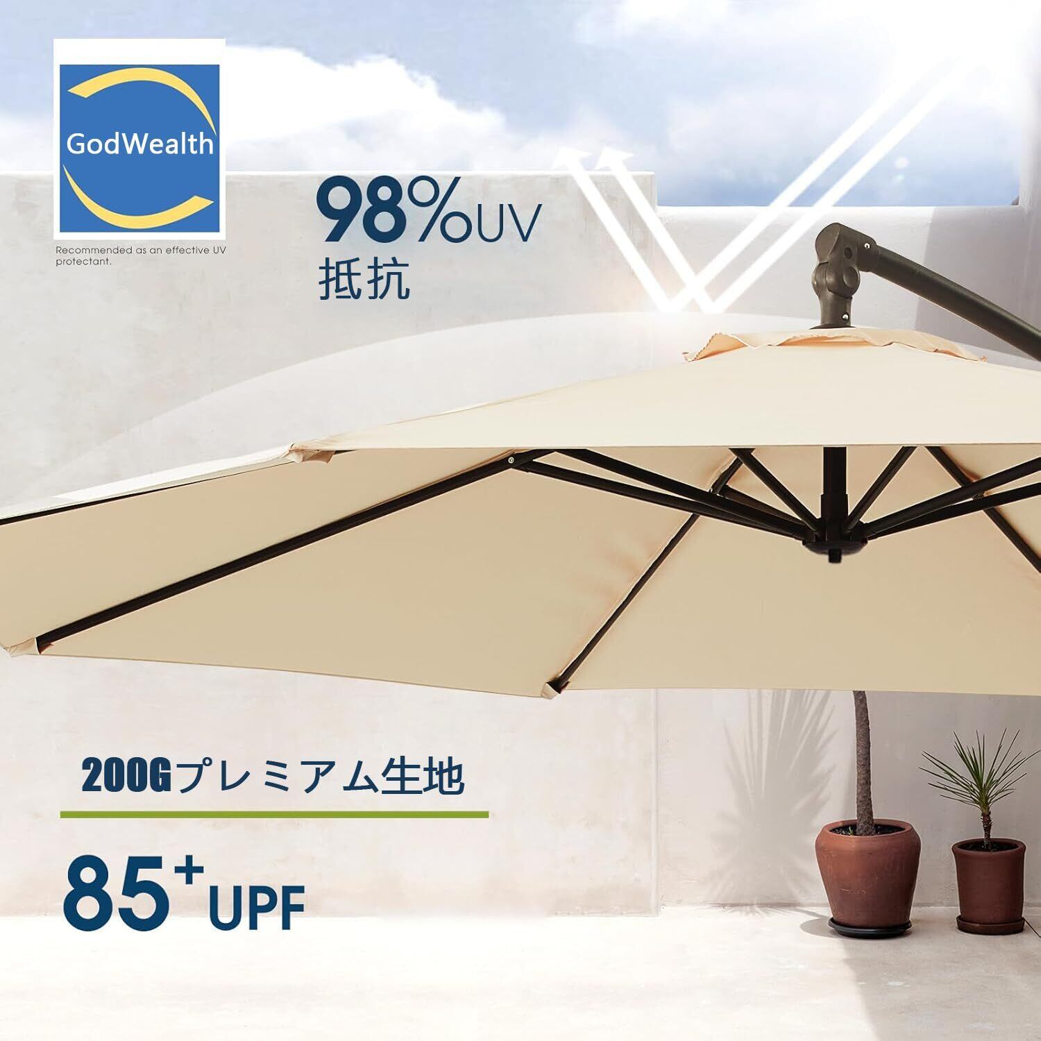 美しい屋外の外観: GodWealth 300CM パラソルは、パティオや屋外のクリエイティブなスペースに色彩、涼しい日陰、快適な雰囲気を大幅に追加できます。パティオ、庭、プール、デッキ、裏庭など、さまざまな屋外環境に適しています。