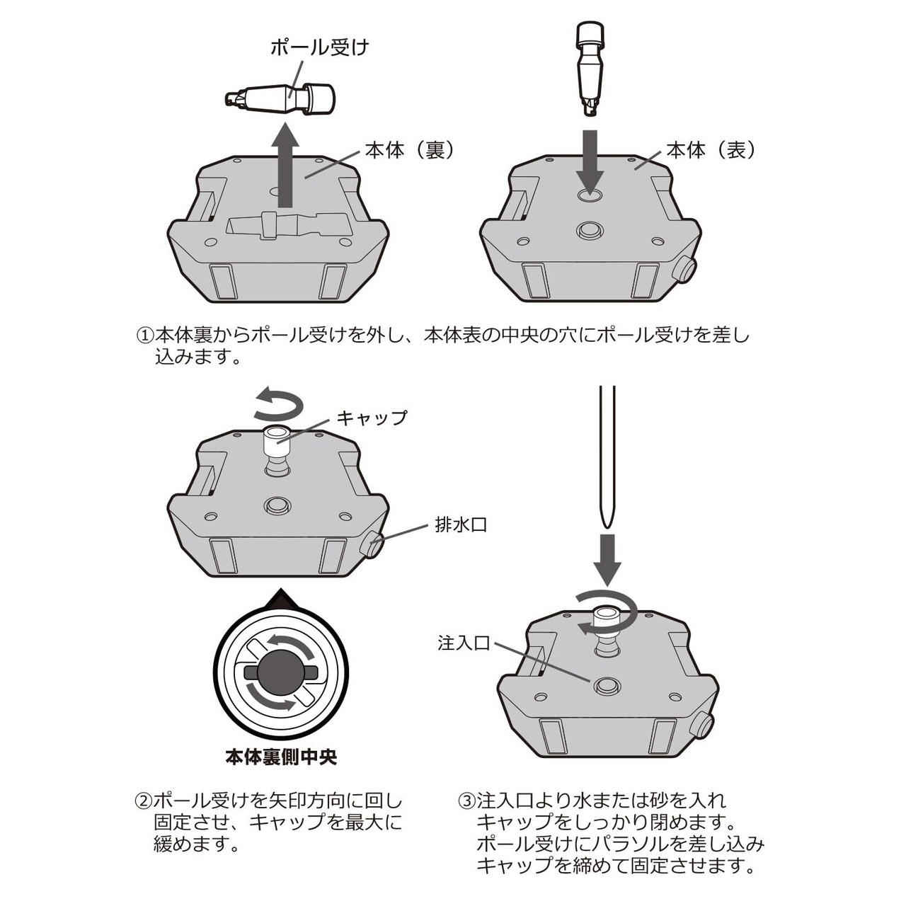 ※水または砂を入れた状態で移動させる時は必ずパラソルを外して行ってください。