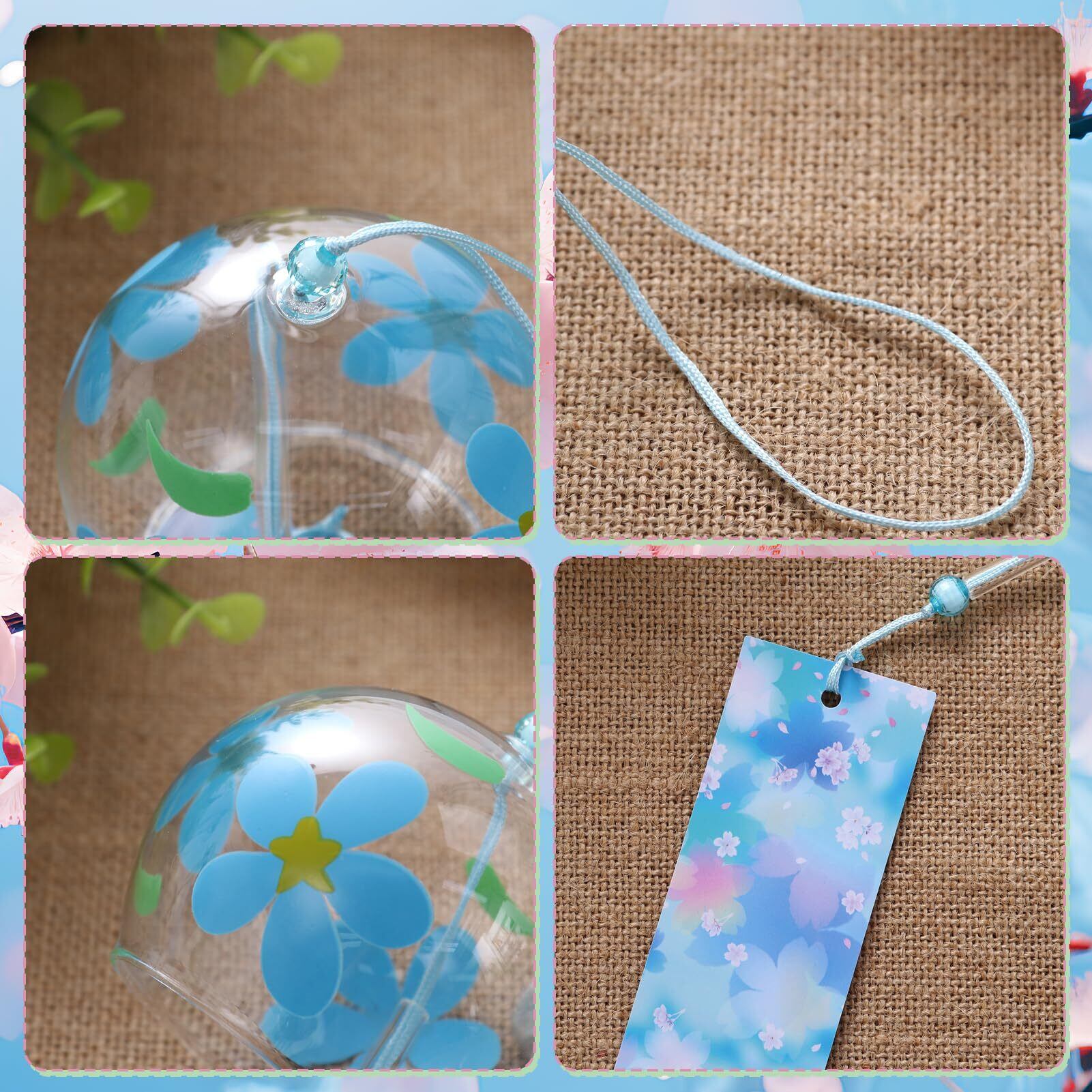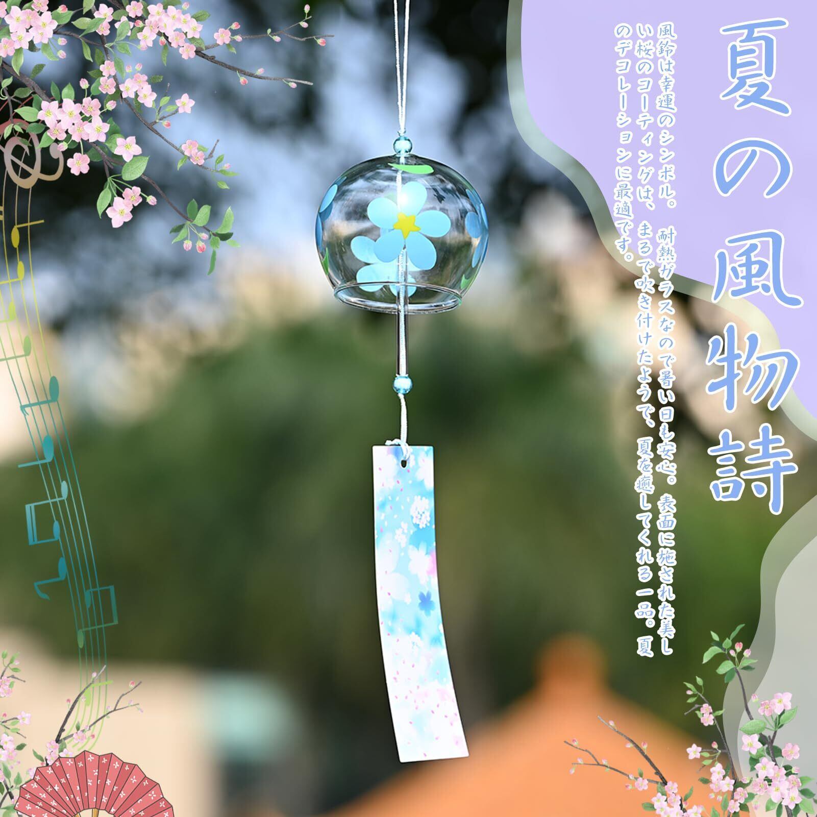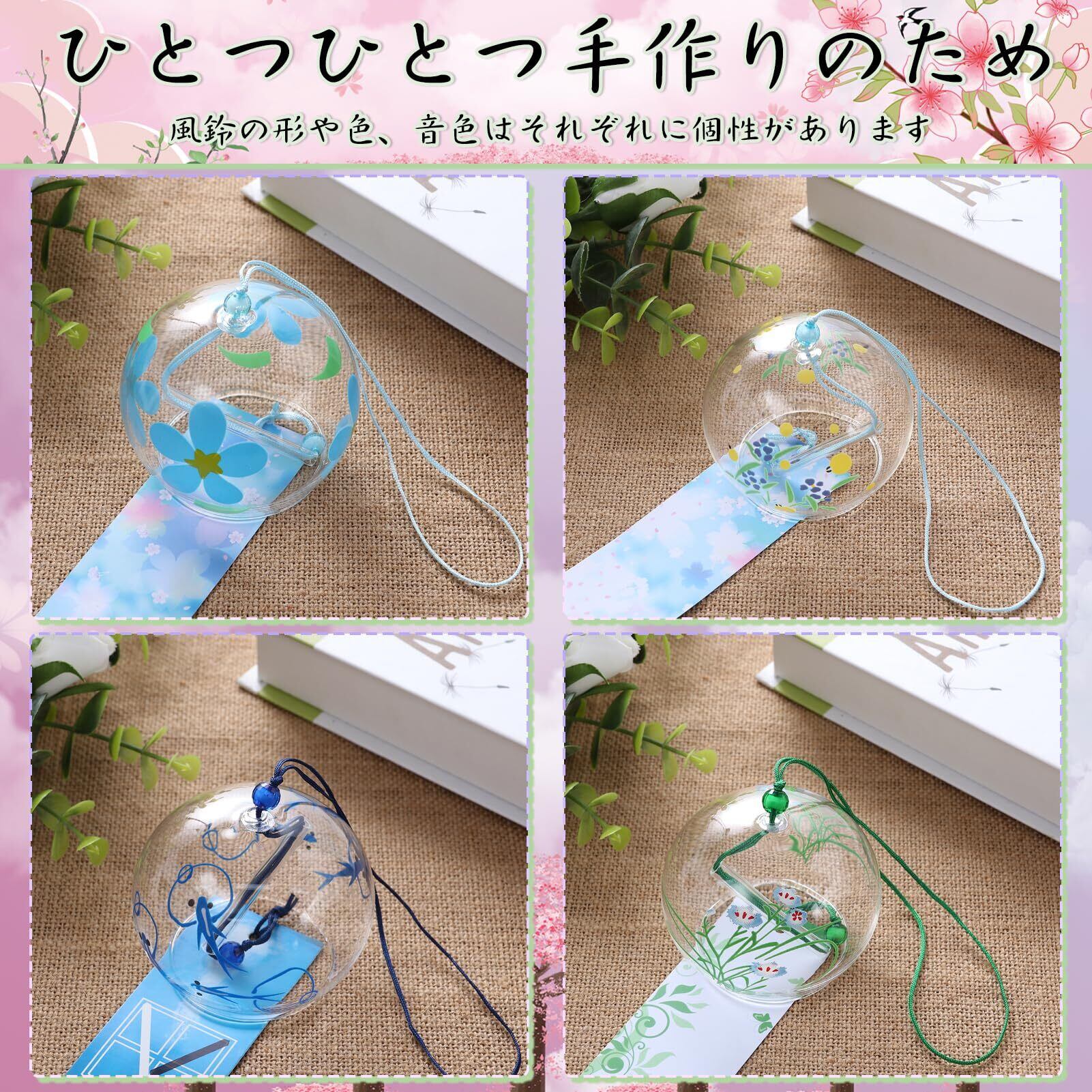 【製品仕様】主な素材は高ホウケイ酸ガラスで、強度が高く、硬度が高く、透過率が高いの特徴があり、風鈴が透明でクリアになります。6個セットと4個セット。和風風鈴、手吹きガラスの風鈴で、精緻な手描きと美しい花柄が描き込まれています。おしゃれな装飾で、様々なスタイルで、夏にぴったりです。職人が手作りで、サイズや色、柄に軽微な誤差がある場合があります。