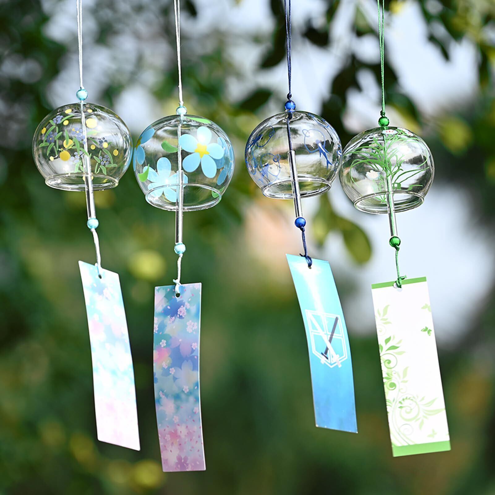 風鈴 手作り風鈴 ガラス風鈴 江戸風鈴 癒しの音 和風 涼しい感じ 夏の風物 涼を楽しむ おしゃれ インテリア 飾り物 雰囲気作り 吊り飾り 屋根飾り おみやげ 祝福 贈り物 2種セット ((ブルー魚+ブルーベル +蛍+ランソウ)4個セット)