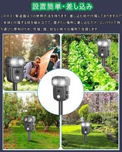 【設置簡単&品質】差し込む杭が付属しておりますので、本体と付属する杭を組み立てて、置きたい場所に差し込むだけ。また、コンパクトで持ち運びに便利のため、花壇、庭、畑など様々な場所で活躍します。 また、照度検知器を内蔵し、夜間で自動的に起動します。夜でもお客さんの財産や家畜を守って、不必要な損失を避けます。ご購入日から12ヶ月間品質があり、24時間専門の顧客サービス、1年以内の返品理由なし、1年以内の新品交換は無料。開封済みやご使用後の商品でも対応いたします。それはあなたにどんな販売前と販売後の質問を提供するために私たちの喜びです。あなたが製品に何か助けを必要とする場合は、お気軽にお問い合わせください。