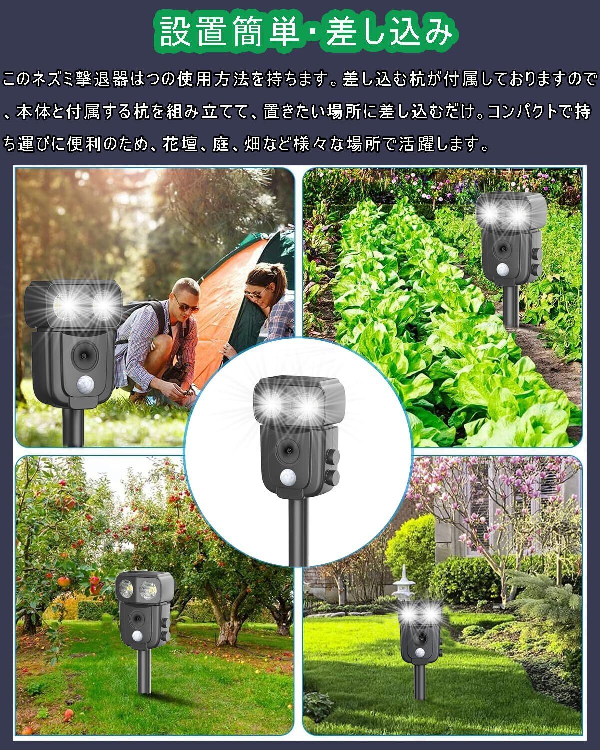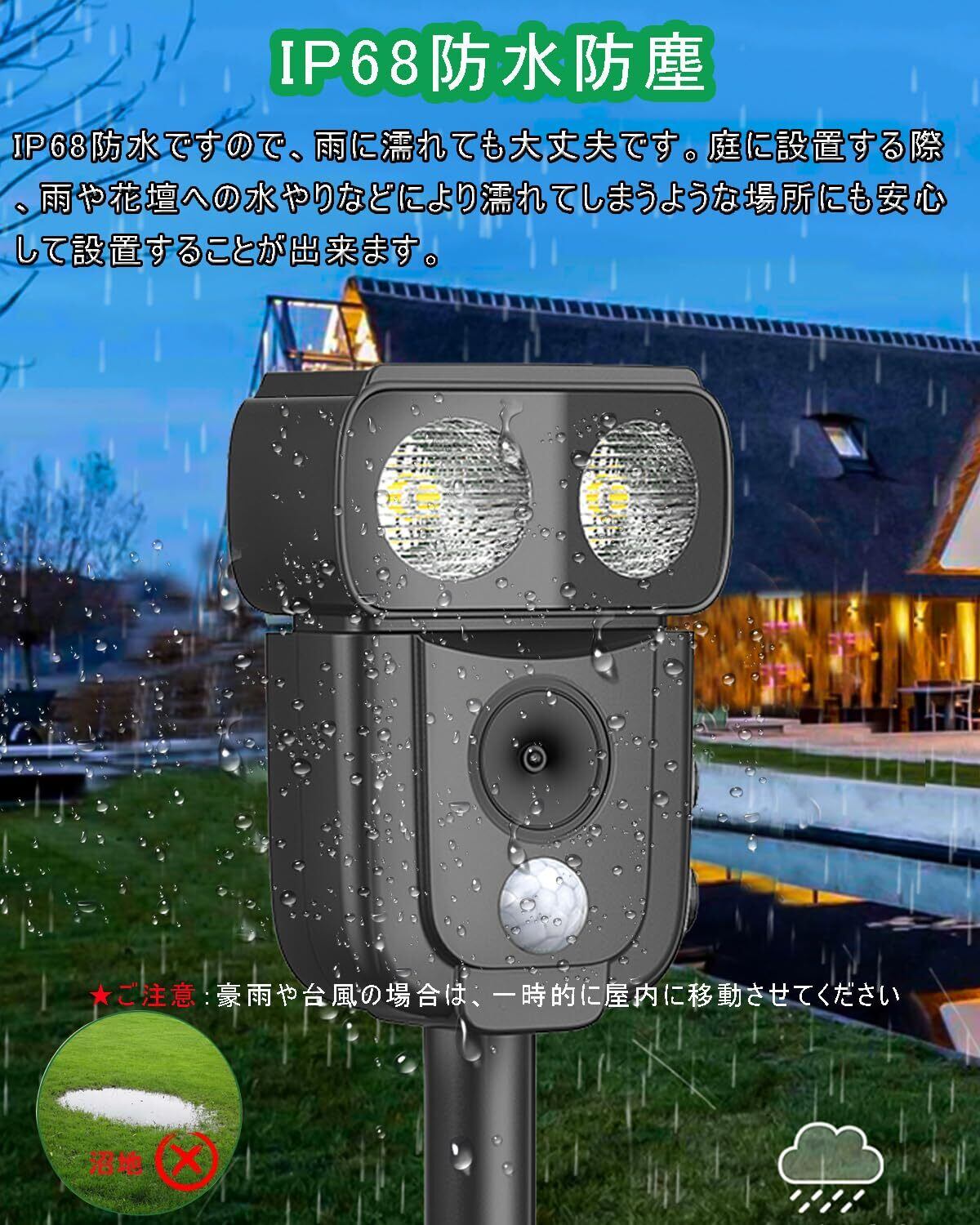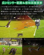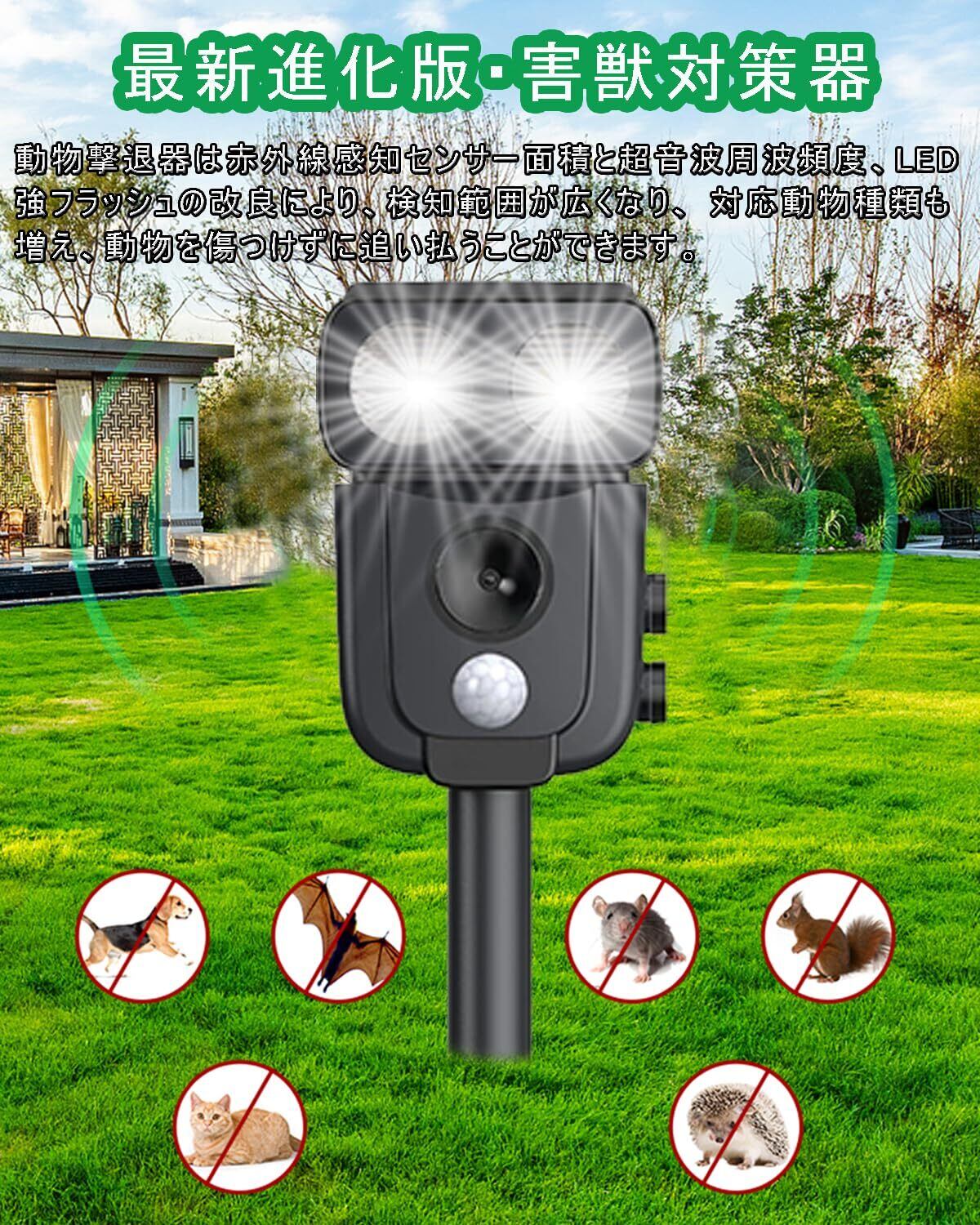 【2025最新増強版&害獣対策器】最新高機能版の動物撃退器、赤外線自動感知で害獣などを感知。感知すると超音波スピーカーで、動物が嫌がる超音波を発生。動物は機械に慣れるという特性がありますが、当製品は揺らぎのある超音波で、厄介な動物慣れを防ぎます。改良版の動物撃退器は赤外線感知センサー面積と超音波周波頻度、LED強フラッシュの改良により、検知範囲が広くなり、対応動物種類も増え、退治効果も増強できました。動物愛護の観点から作られた撃退器です。動物を傷つけずに追い払うことができます。