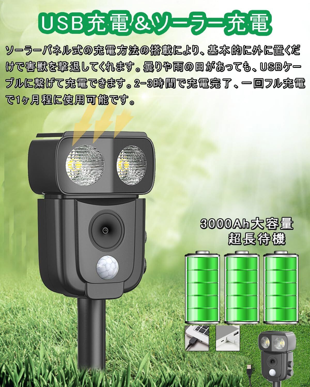 【2つの充電方法&IP68防水】ソーラーパネル式の充電方法の搭載により、基本的に外に置くだけで害獣を撃退してくれます。3000Mahバッテリーを内蔵、電池交換不要、超長時間作動できます。曇りや雨の日があっても、USBケーブルに繋げて充電できます。2-3時間で充電完了、一回フル充電で1ヶ月程に使用可能です。長時間IP68級の防水効果を備え、梅雨など連日の雨の日でも、 鳥よけや猫除け対策としてご利用いただけます。(長くお使いいただくために、台風や大雨などの悪天候の際には屋内保管推奨。)ご注意:ソーラーパネルの保護層を外して、駆除機を害虫の発生源の方向に置く。