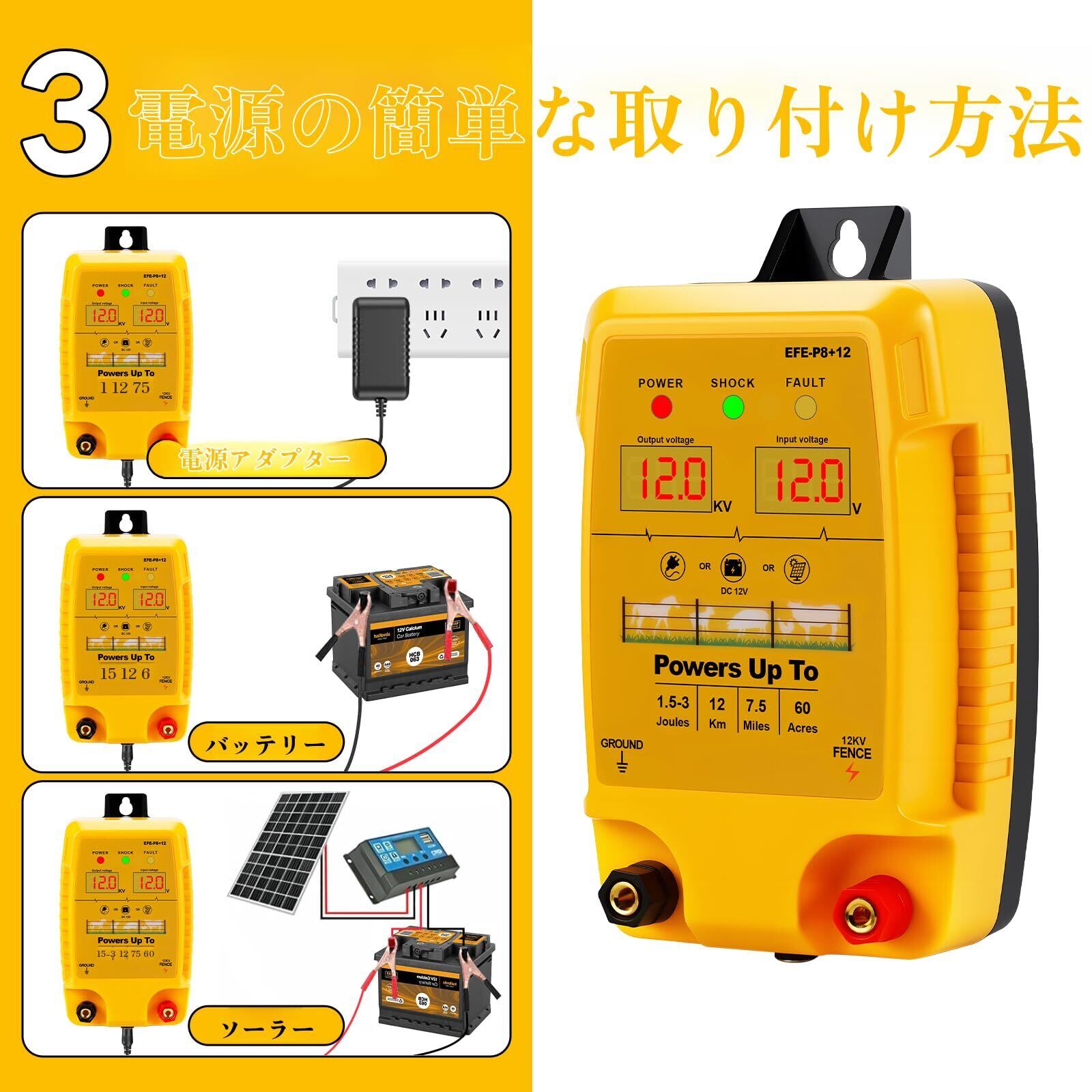 【豊富な電源オプションで使い勝手アップ】この充電器は、様々なニーズや状況に合わせて複数の電源オプションを提供します。便利な 110V AC プラグ、付属のワニ口クリップを使った 12V 車バッテリー接続(バッテリーは別売)、ソーラーパワー利用(バッテリーは別売)など、多種の電源に対応しています。これにより、様々な場所での使用に柔軟に対応でき、畜産現場の状況に合わせて最適な電源を選択できます。